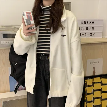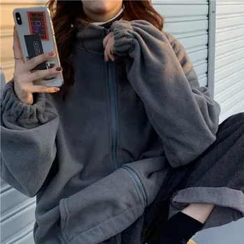 מעילי נשים רופף בתוספת קטיפה רוכסן כיסי מכתב מזדמן ענקיות BF Ulzzang Harajuku יומי Streetwear נשים אופנתי חדש חם