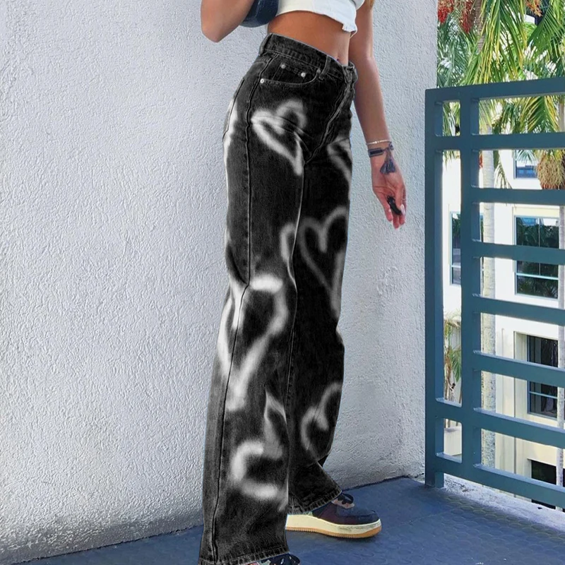בציר לב מודפס Y2K בבאגי ג 'ינס נשים גבוהה מותן Harajuku אסתטי אמא ג' ינס ג 'ינס Streetwear 90s מכנסיים Cuteandpsycho