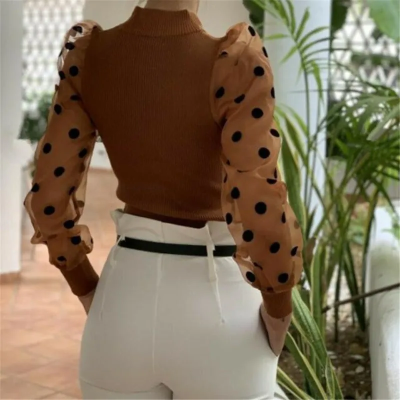 גולף סרוג מנוקדת פאף ארוך שרוול חולצה נשים Mesh Sheer לראות דרך חולצה אלגנטית גבירותיי Slim חולצות Blusa Femme