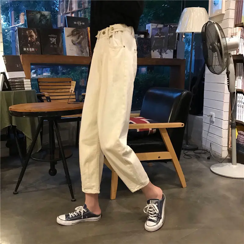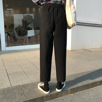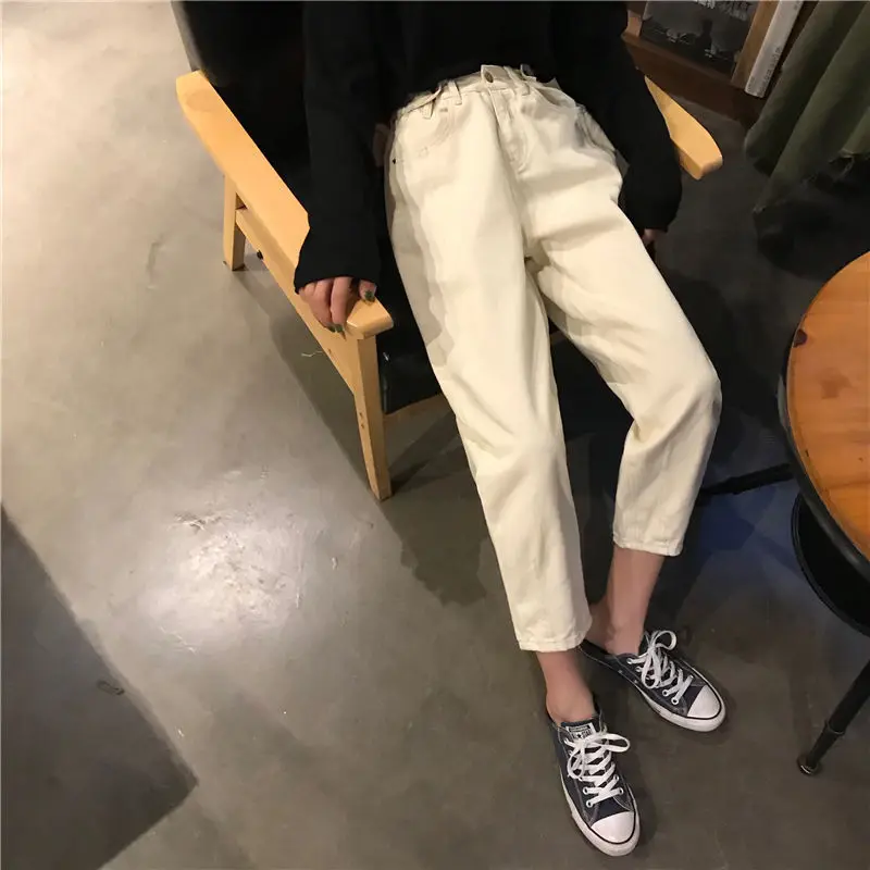 ג 'ינס נשים בתוספת גודל מוצק גבוהה מותניים Ulzzang Harajuku קוריאני סגנון וינטג' אופנתי נקבות מכנסיים כיסים פשוט שיק
