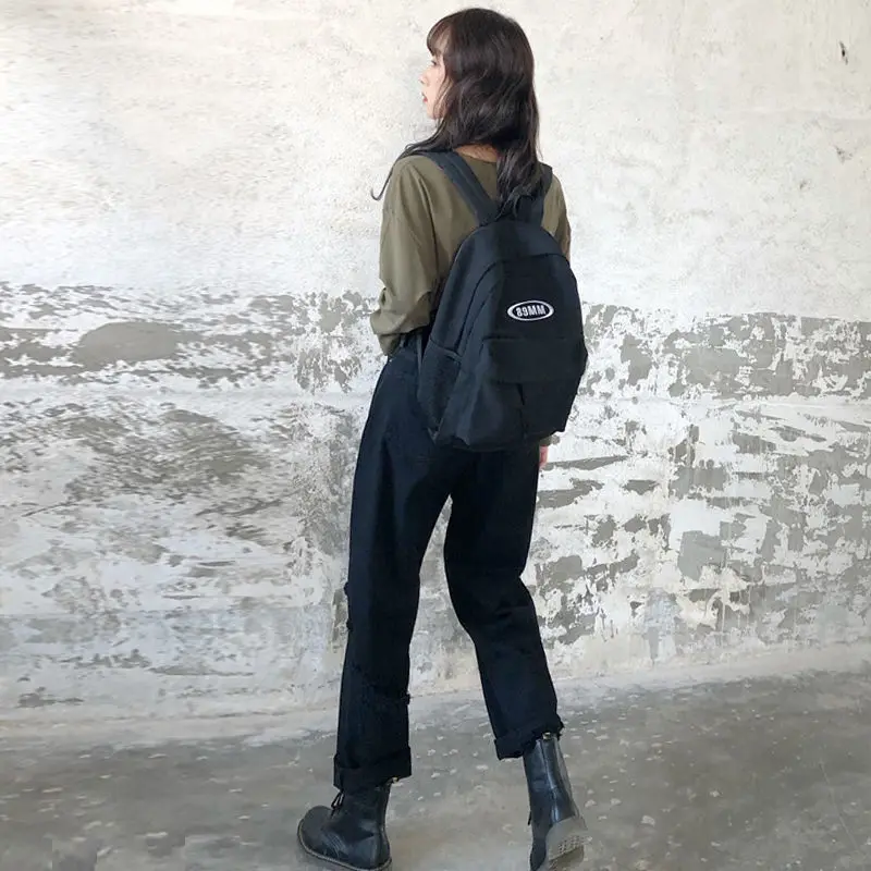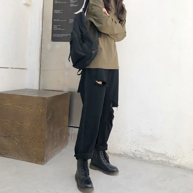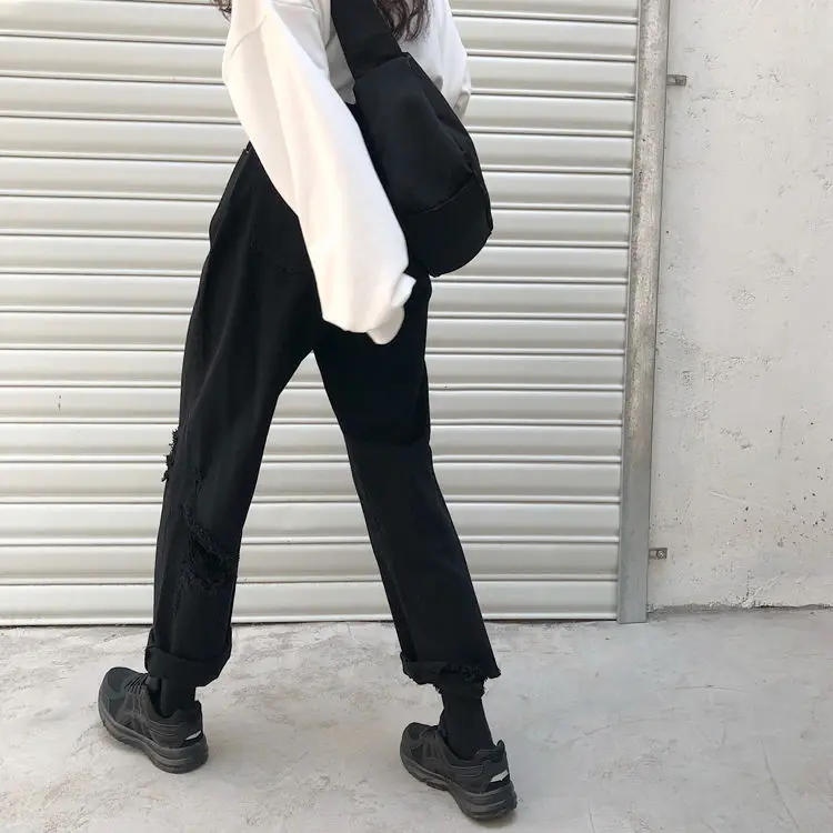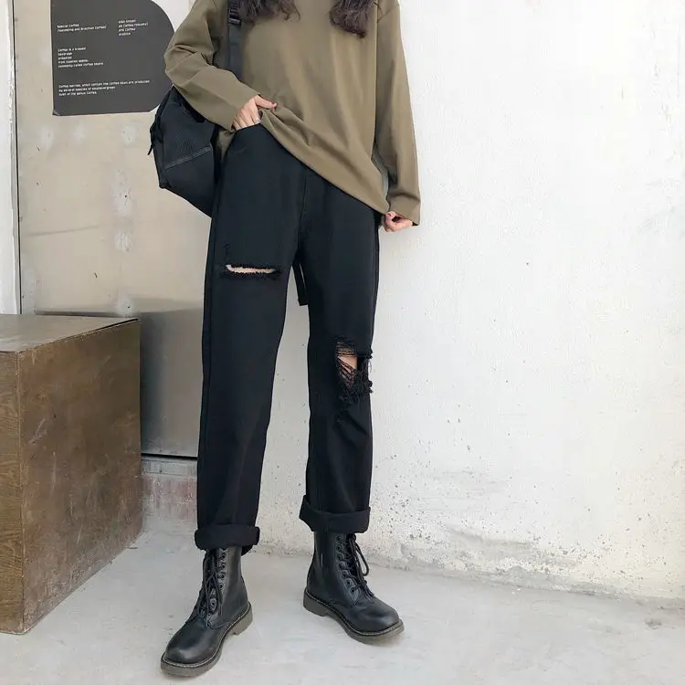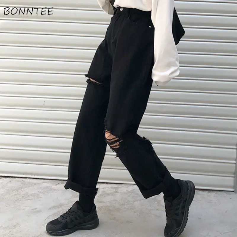 ג 'ינס נשים ג' ינס חור רוכסן כפתור כיסי Loose ישר מקרית מכנסיים קוריאני טרנדי רטרו Harajuku יומי נשים Streetwear