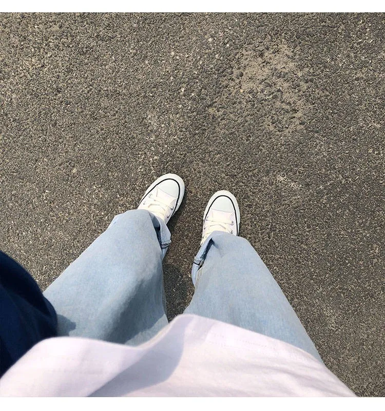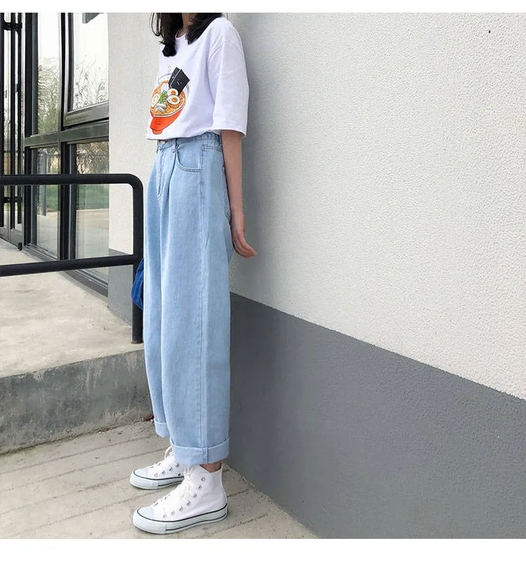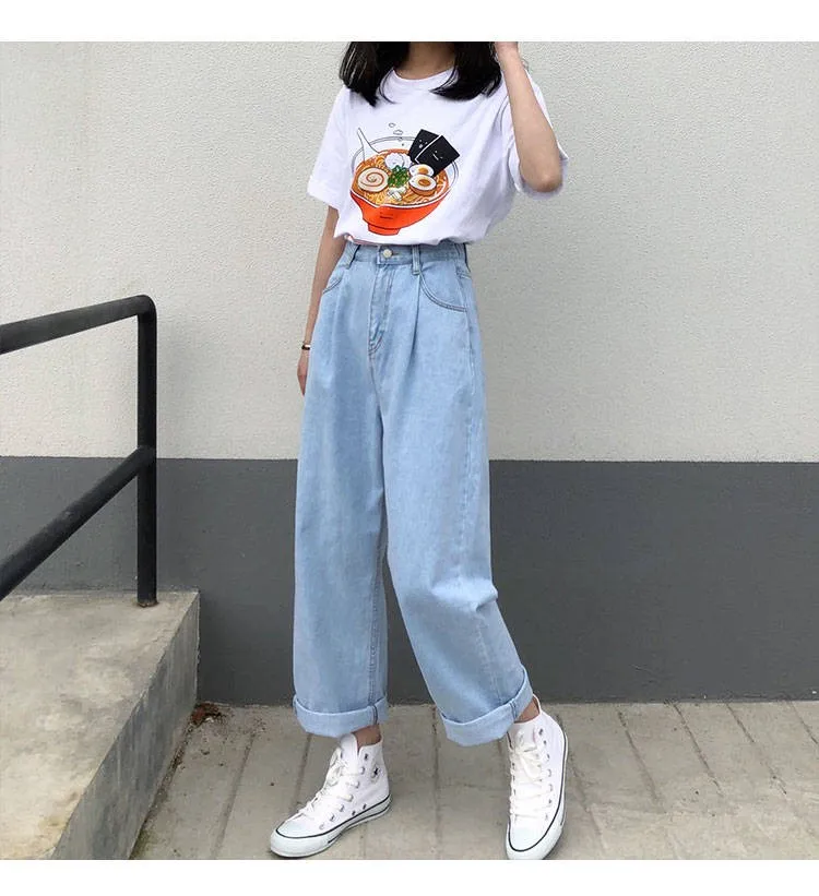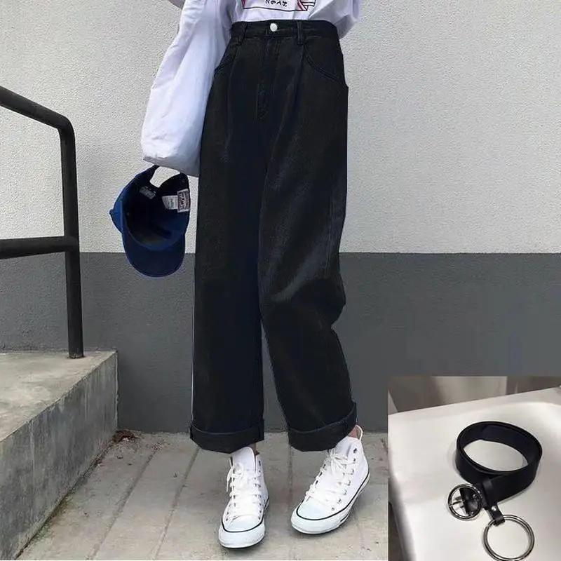 ג 'ינס נשים מוצק בציר גבוה מותניים רחב רגל ינס מכנסיים פשוט תלמידי כל-להתאים רופף אופנה Harajuku נשים שיק מזדמן