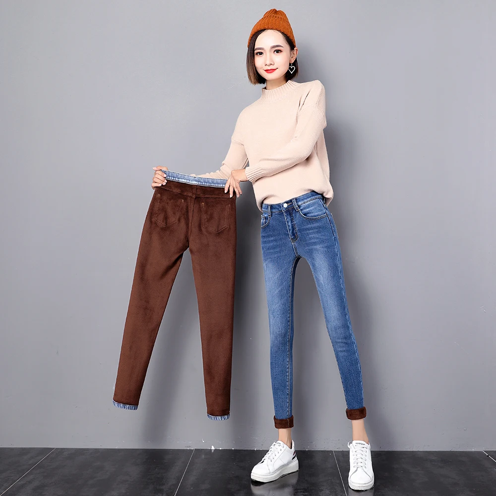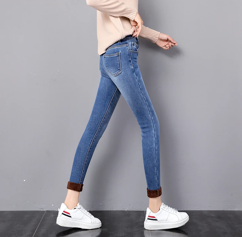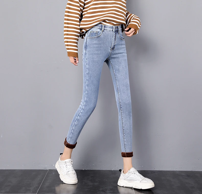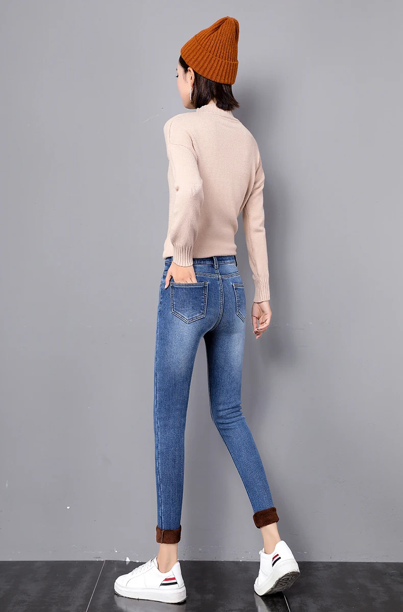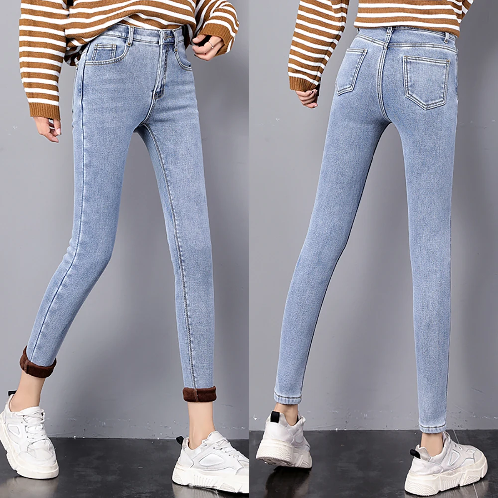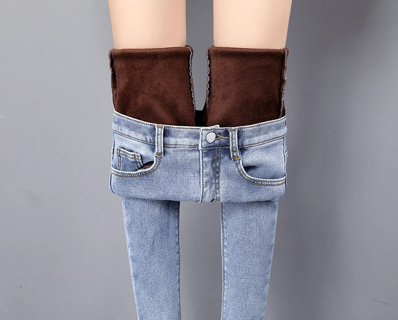 חם לנשים בתוספת גודל חורף כחול אור כחול מוצק סקיני צמר עבה מכנסי עיפרון עם קטיפה ג 'ינס מכנסיים