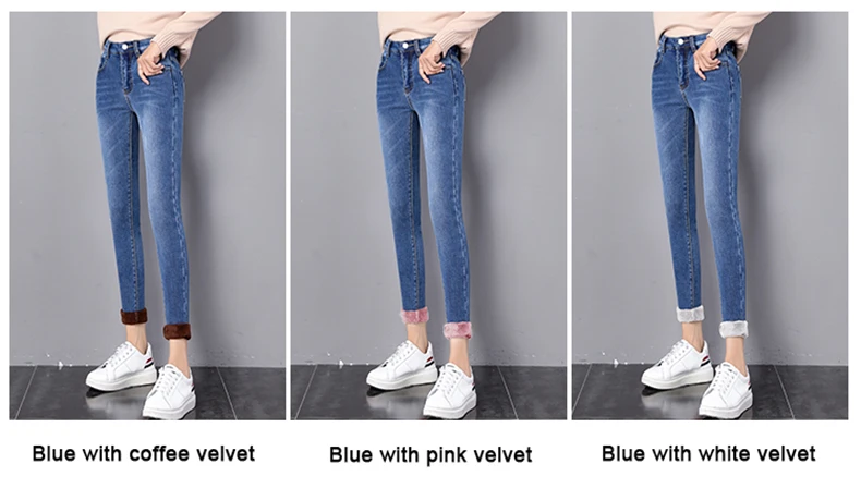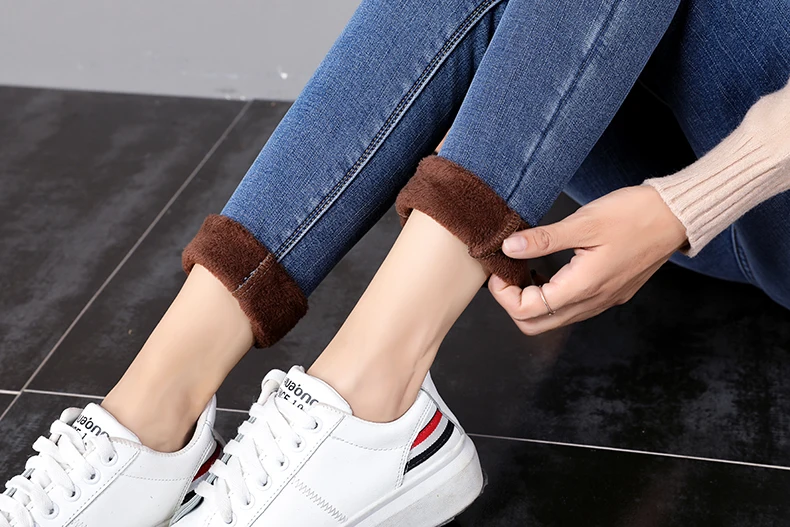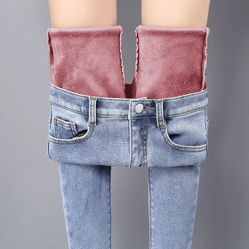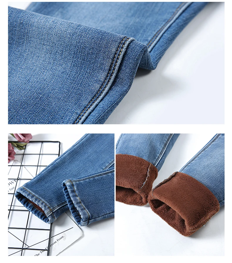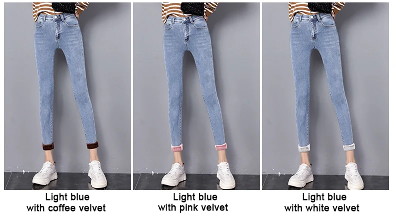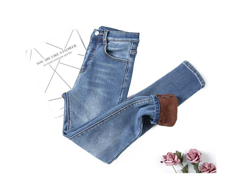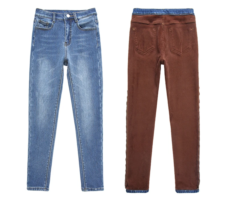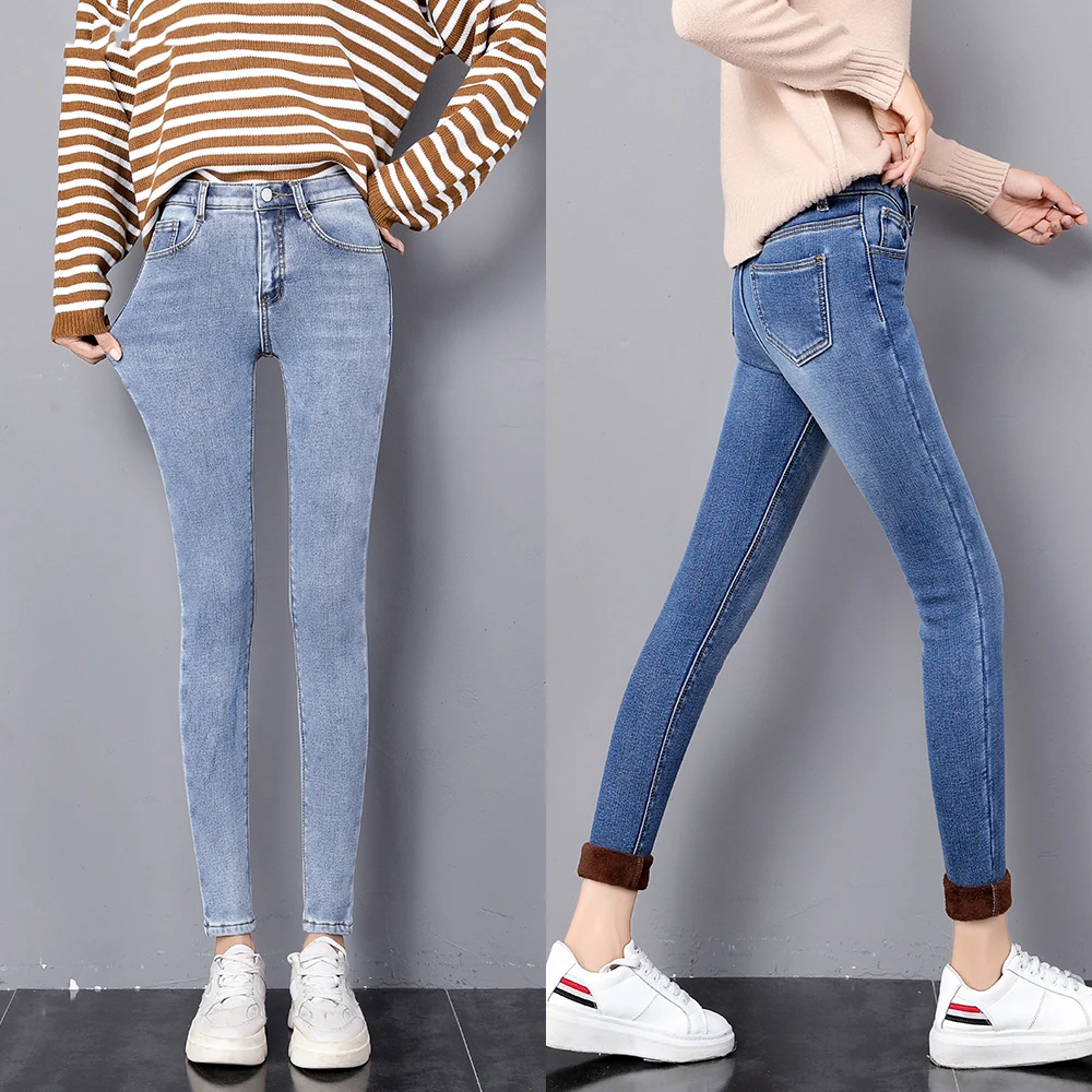 חם לנשים בתוספת גודל חורף כחול אור כחול מוצק סקיני צמר עבה מכנסי עיפרון עם קטיפה ג 'ינס מכנסיים