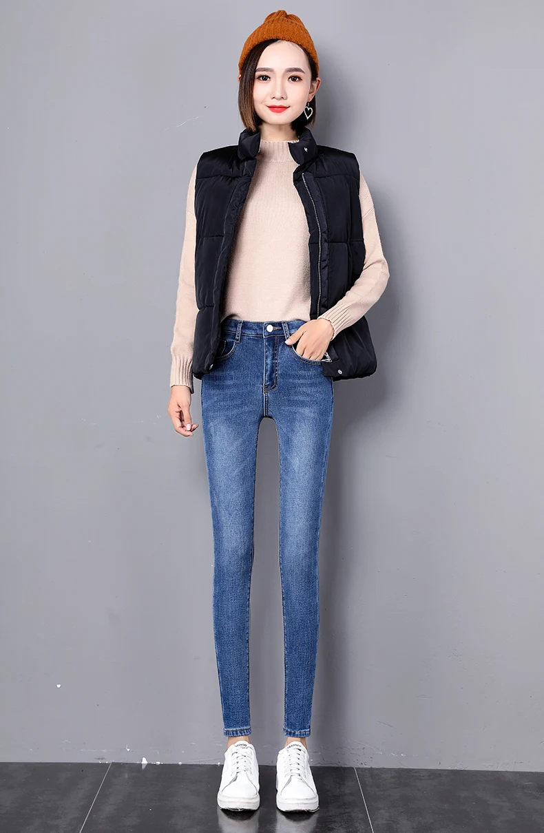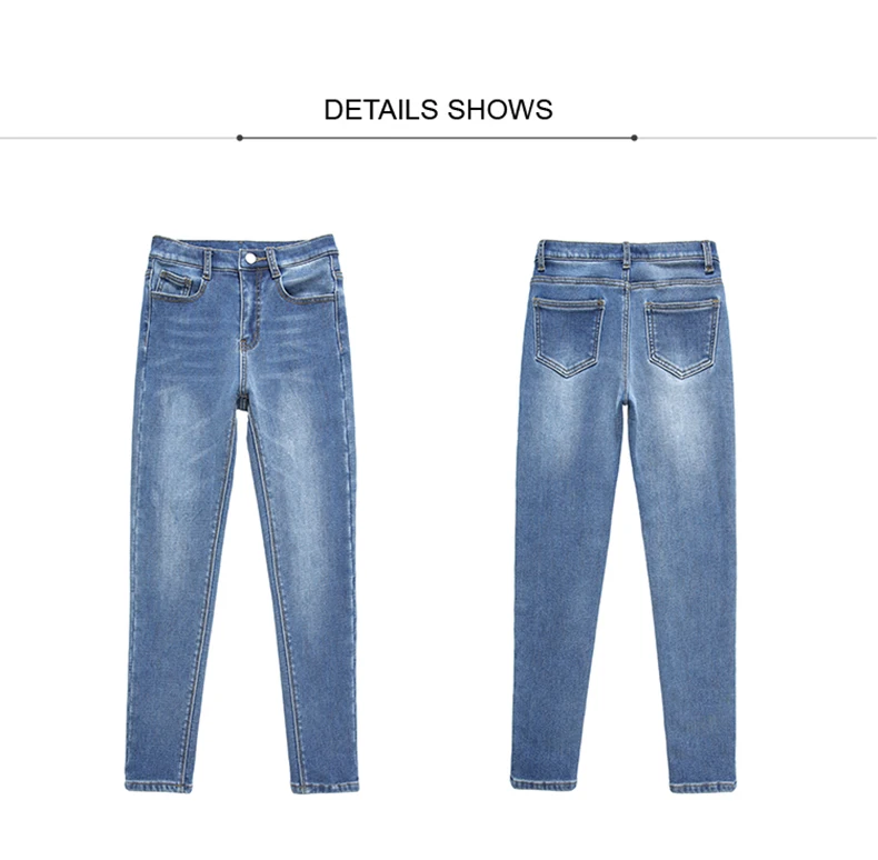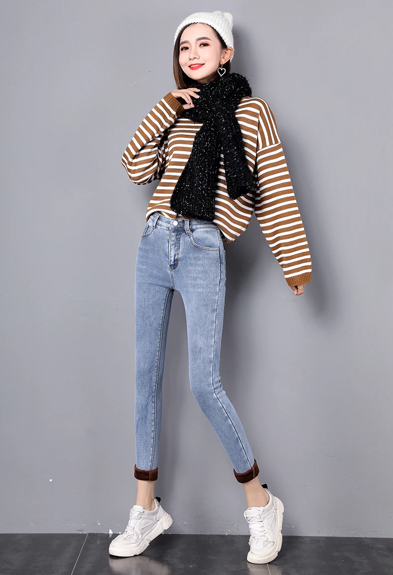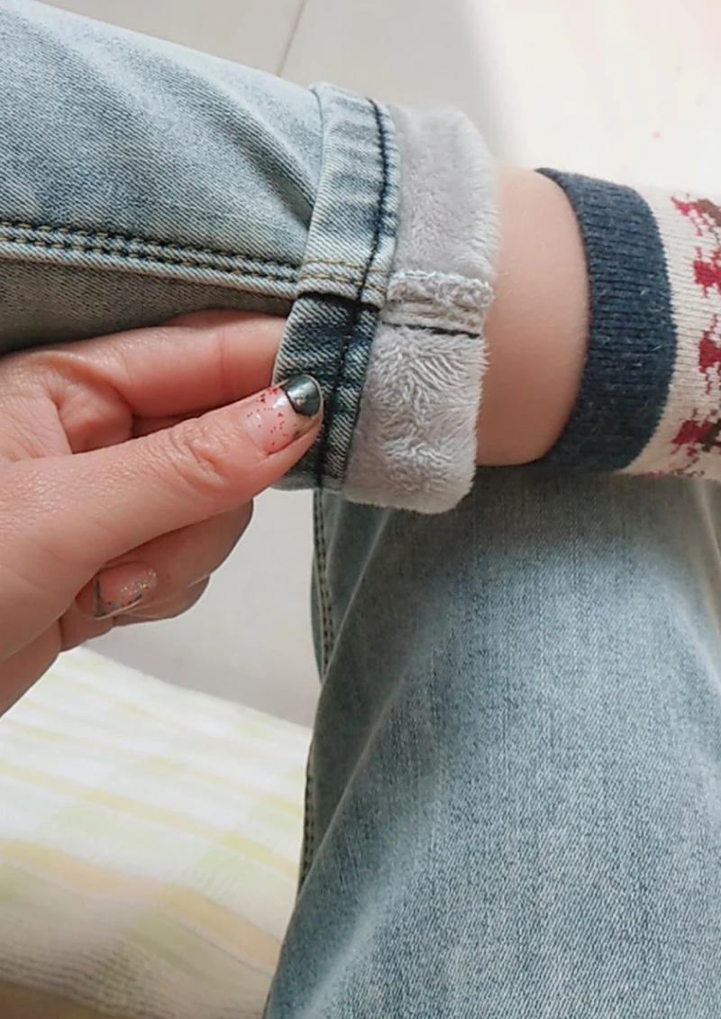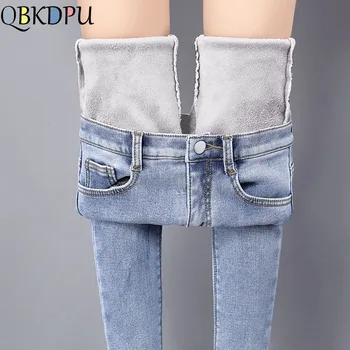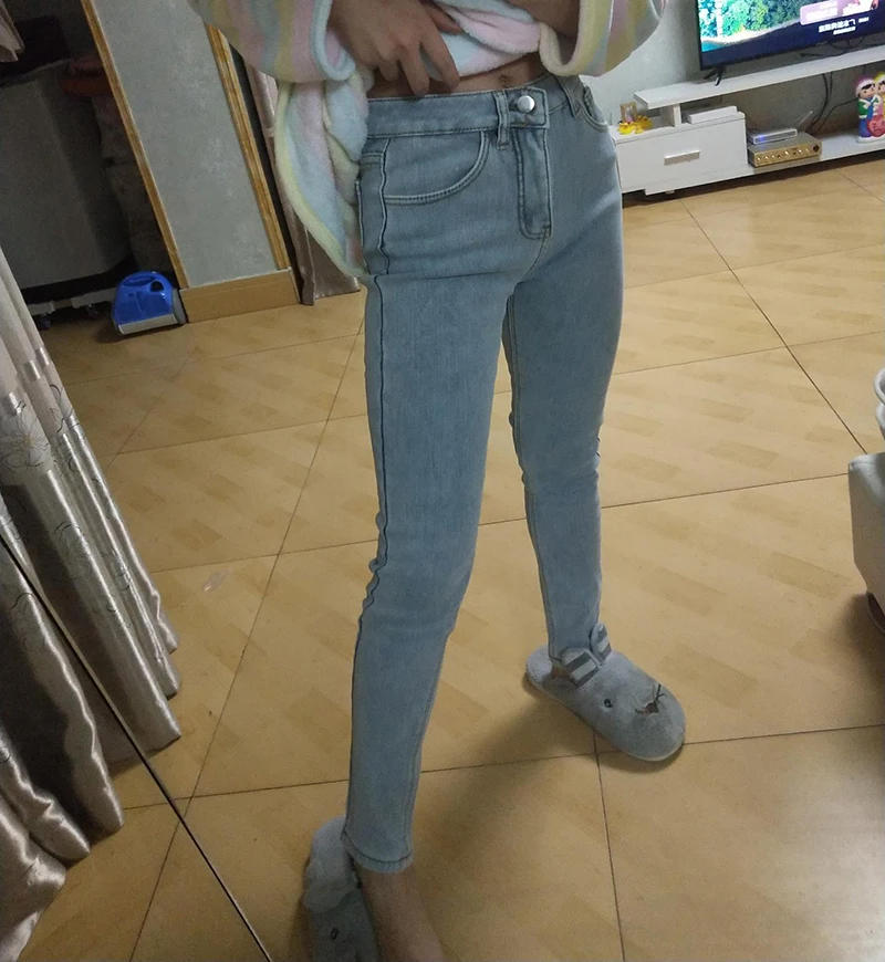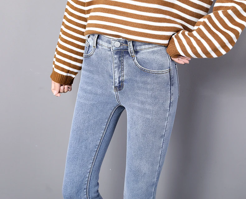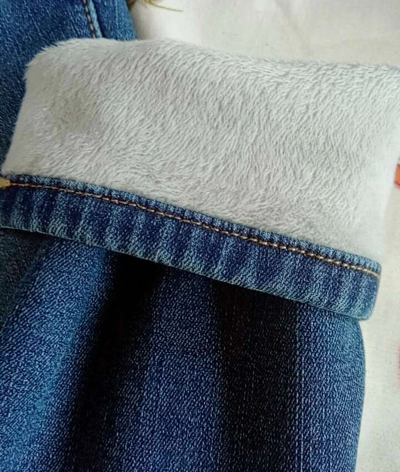 חם לנשים בתוספת גודל חורף כחול אור כחול מוצק סקיני צמר עבה מכנסי עיפרון עם קטיפה ג 'ינס מכנסיים
