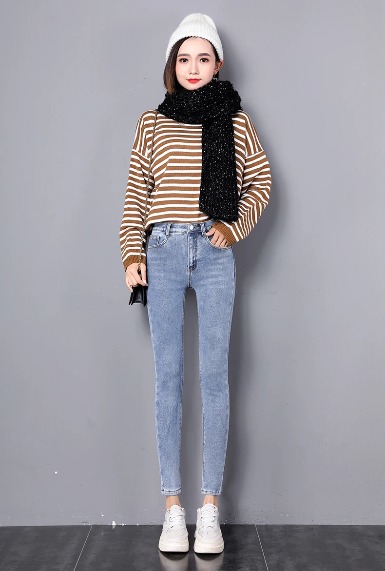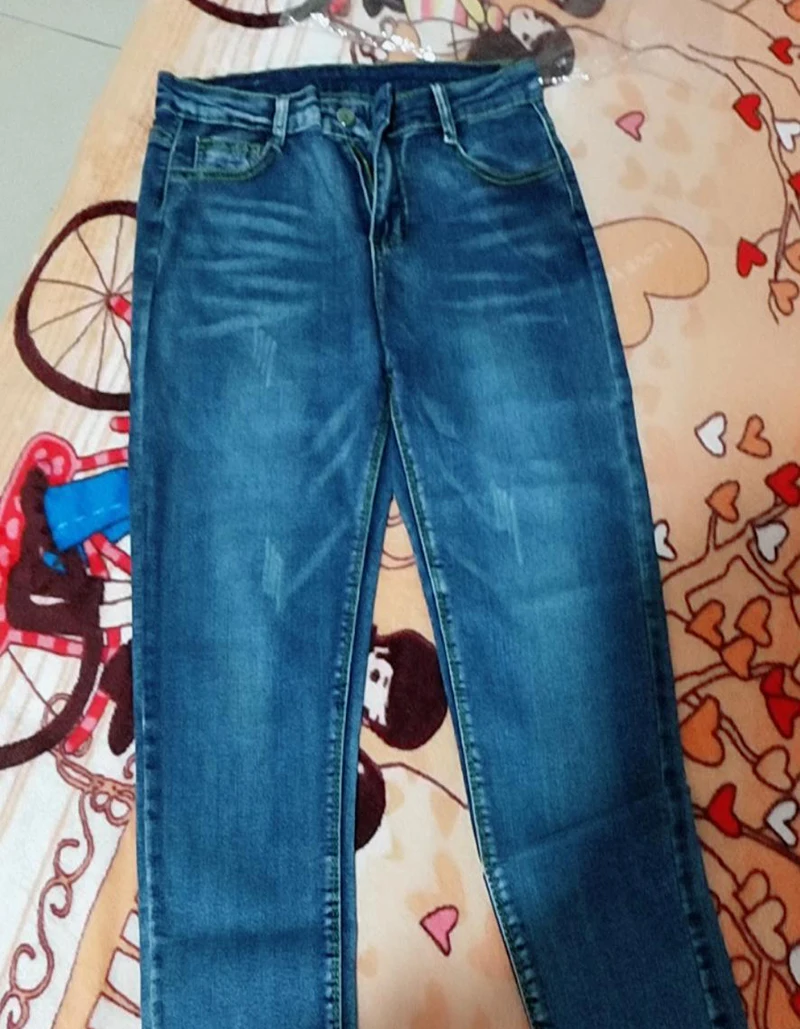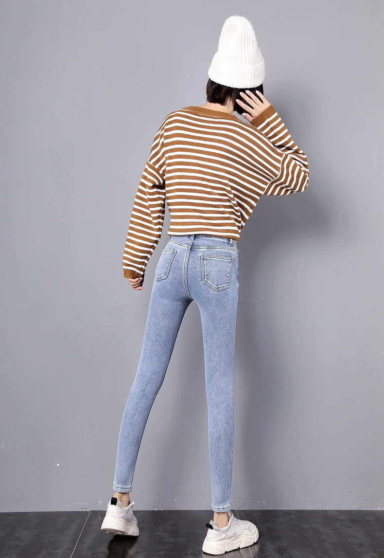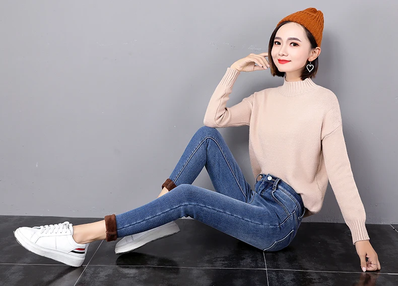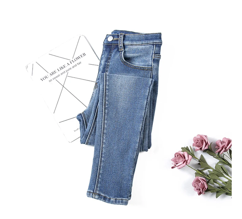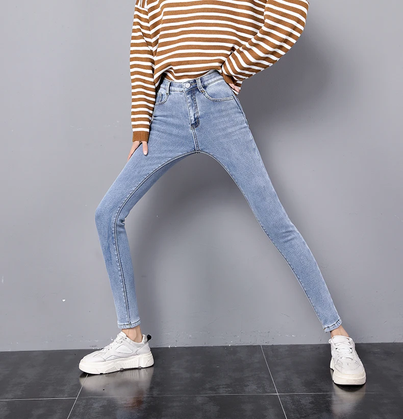 חם לנשים בתוספת גודל חורף כחול אור כחול מוצק סקיני צמר עבה מכנסי עיפרון עם קטיפה ג 'ינס מכנסיים