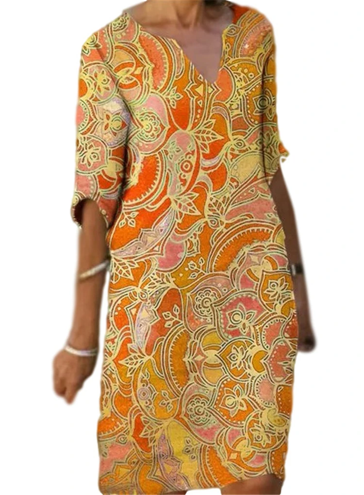 חצי שרוולים V צוואר מודפס Loose שמלת נשים של אופנה מזדמן בציר אביב סתיו כל התאמה בתוספת גודל החוף שמלות Vestidos