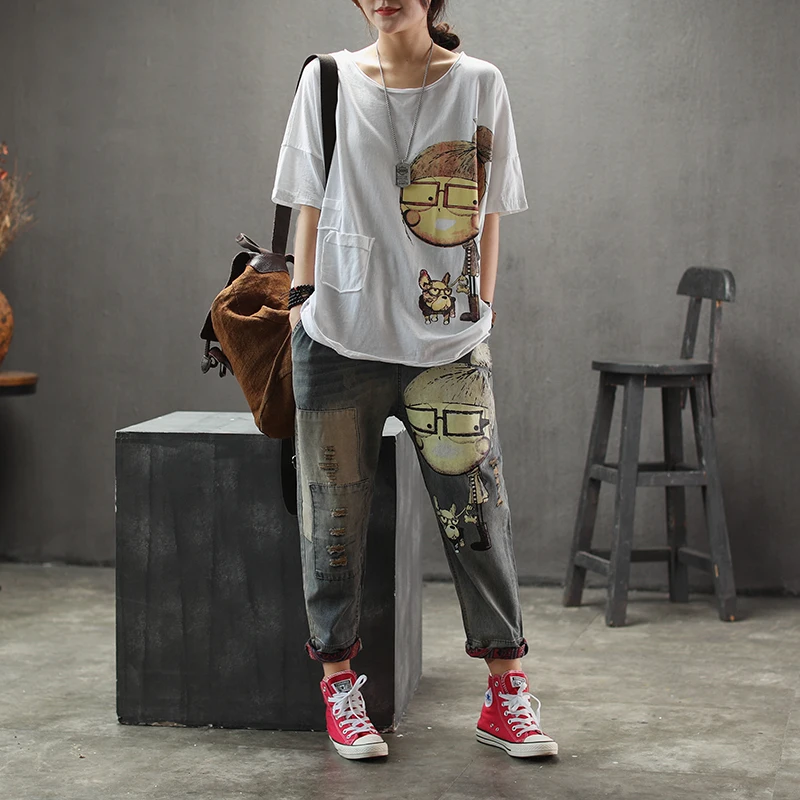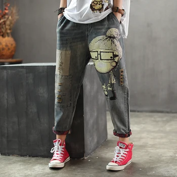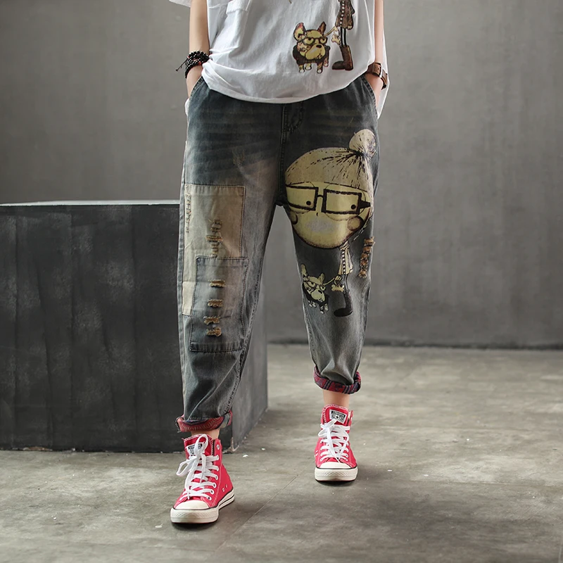 נשים אביב סתיו אופנה מותג בציר קריקטורה כלב ילדה קטנה הדפסת ג 'ינס ג' ינס נשי מזדמן בלוי הרמון מכנסיים מכנסיים
