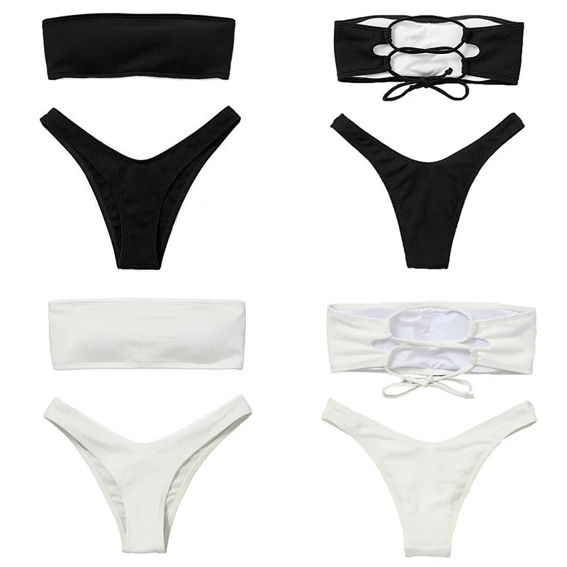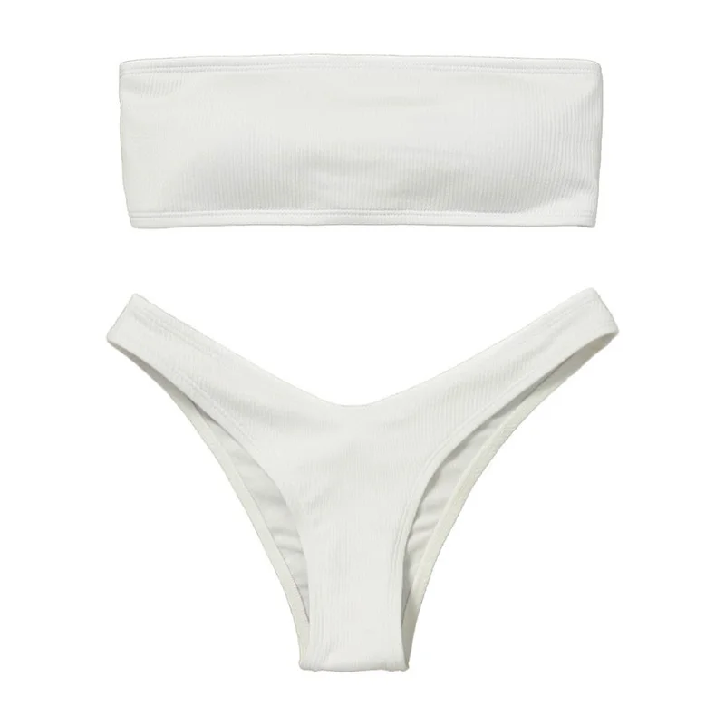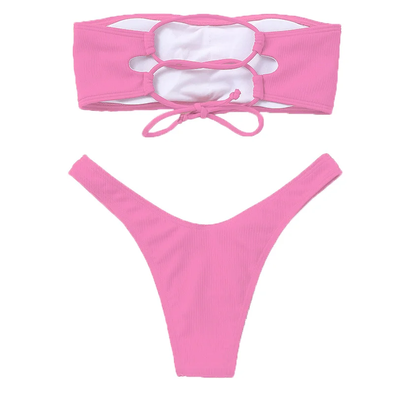 בעל מבנה עם שלנו למתוח מצולע בד, זה פלרטטנית ביקיני סט כולל bandeau למעלה אשר יש שרוכים עיצוב בגב supportless ריפוד כוסות. התאמה תחתון מספק את כיסוי מושלם.