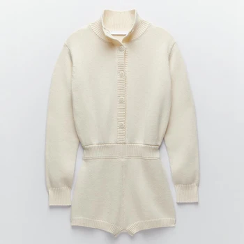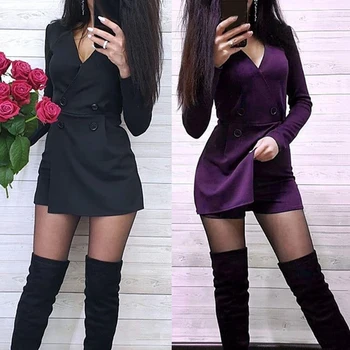 שיק נשים Playsuits מוצק צבע ארוך שרוול V צוואר כפול חזה קצר Playsuit סרבל נשים של Playsuits