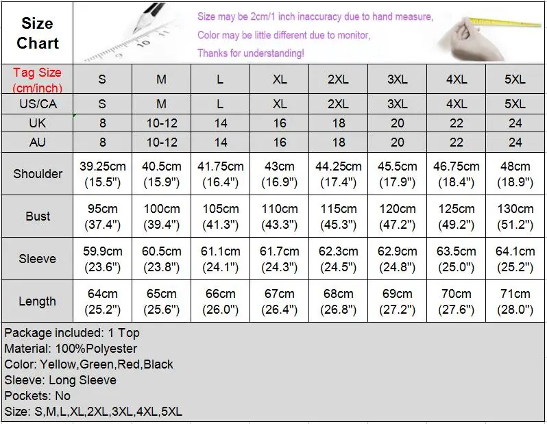 | B סגנון חולצה אנא בדוק את פירוט גדלים על גודל תרשים תמונה לפני לקנות אותו!!! חבילה כללה: 1 למעלה חומר: 100% פוליאסטר צבע: צהוב, ירוק, אדום, שחור שרוול: ארוך שרוול כיסים: לא גודל: S,M,L,XL,2XL,3XL,4XL,5XL דפוס: הדפסה סגנון: פנאי עונה: אביב, סתיו אירוע: מסיבה, חג, Streetwear ![]() ![]() ![]() ![]()