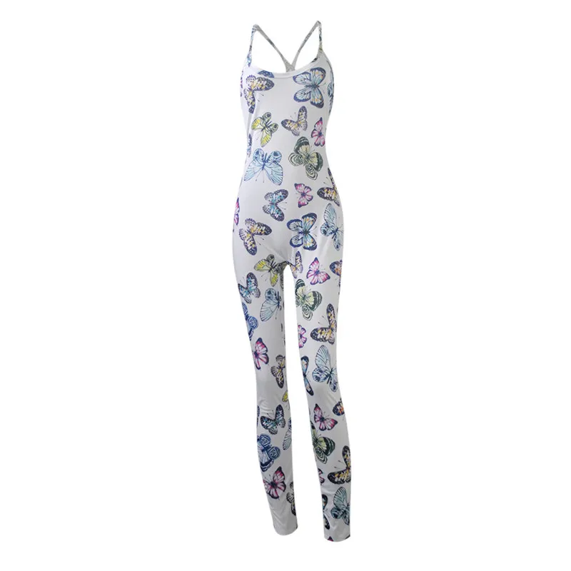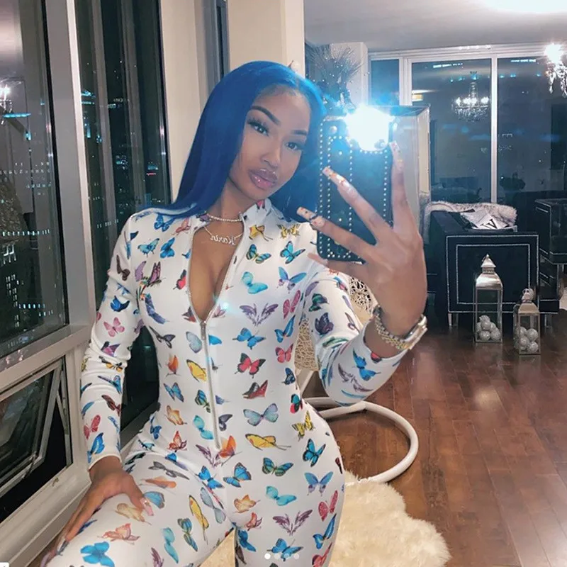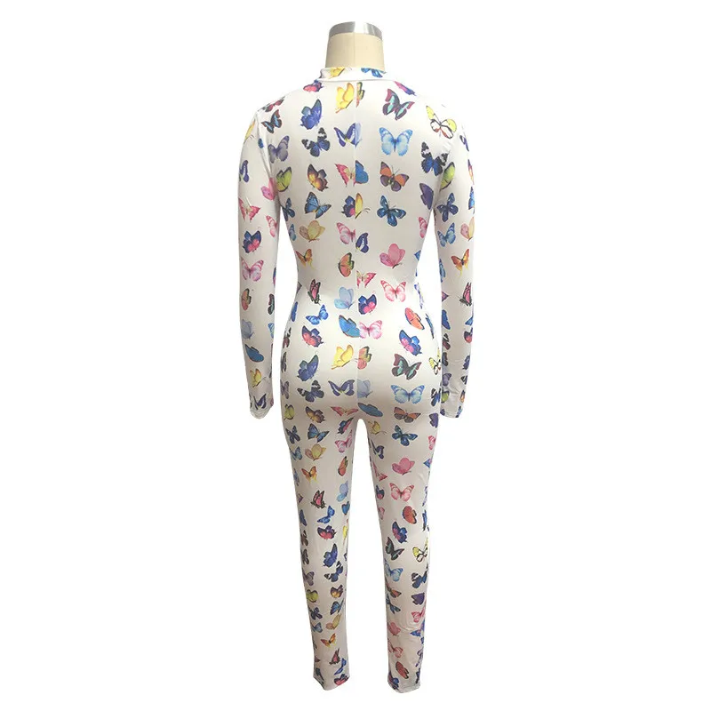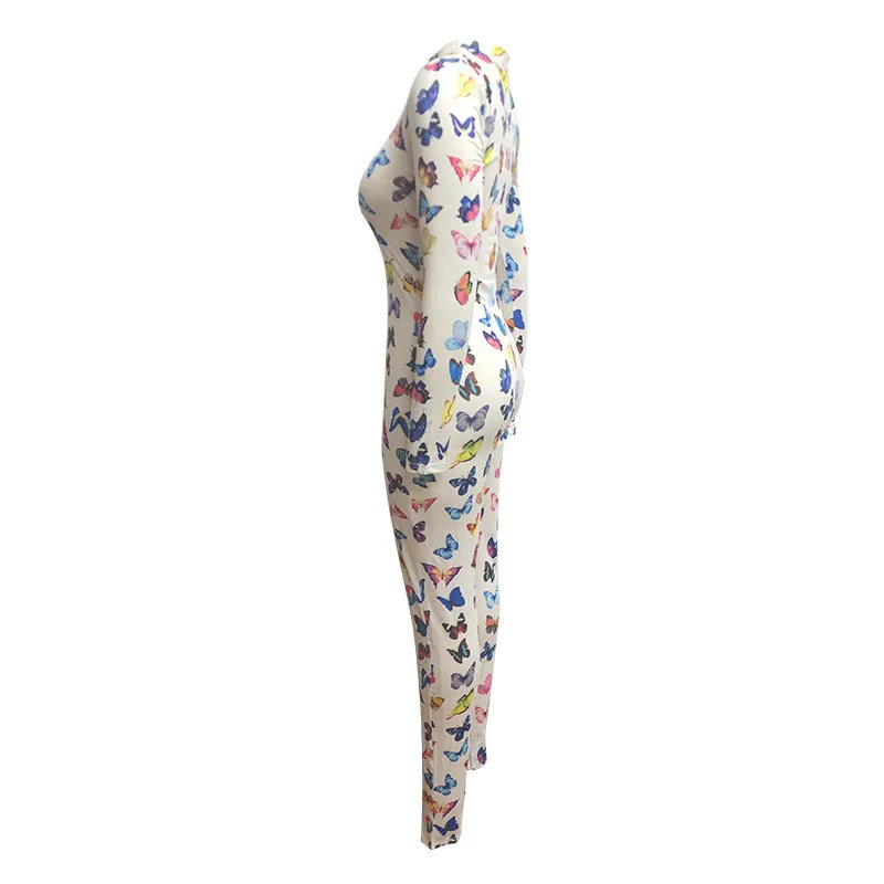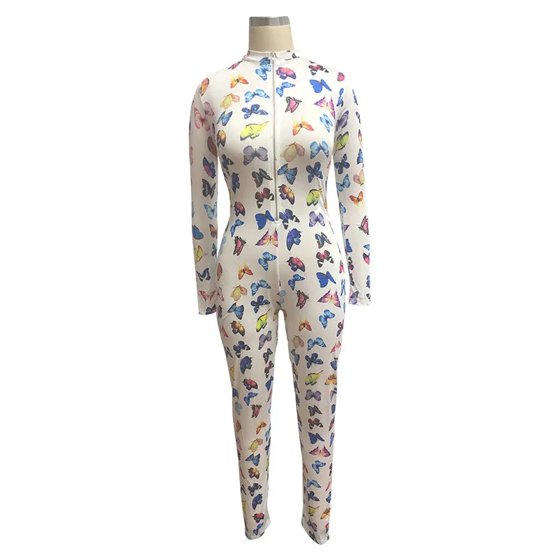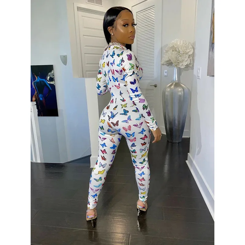פרפר הדפסת סקסי ארוך שרוול Bodycon סרבל Rompers נשים 2020 מול רוכסן Clubwear תלבושות חתיכה אחת Rompers פעיל ללבוש