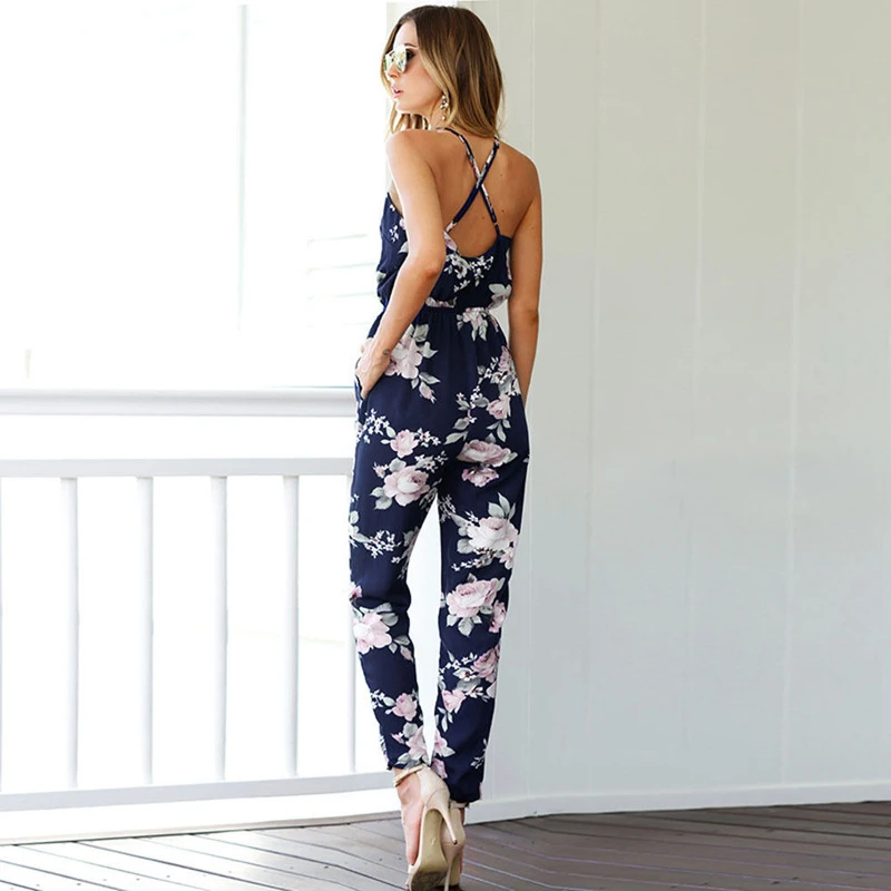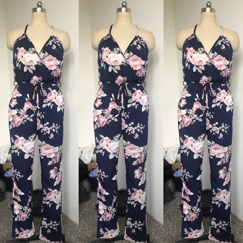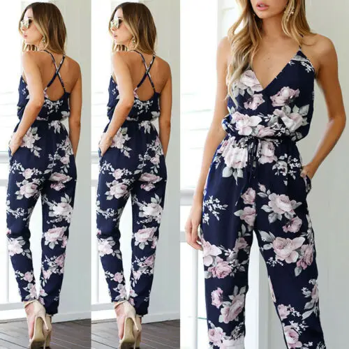 קיץ נשים גבירותיי Playsuit המפלגה סרבל V צוואר פרחוני Bandge Romper גבוהה מותן ארוך מכנסיים מכנסיים Clubwear