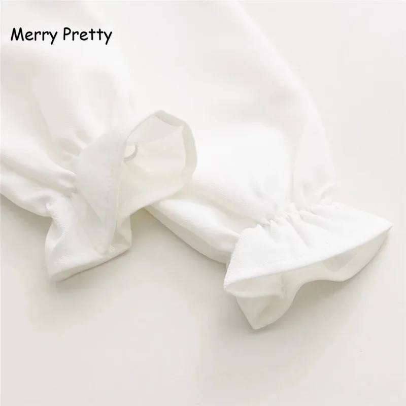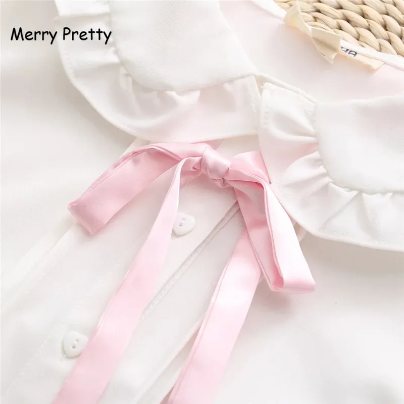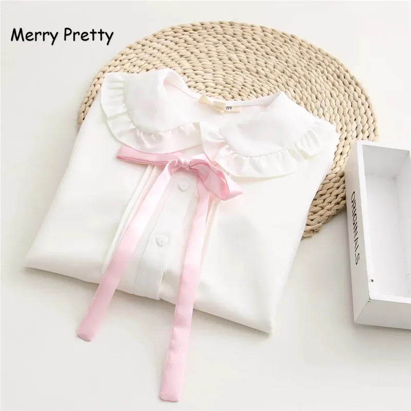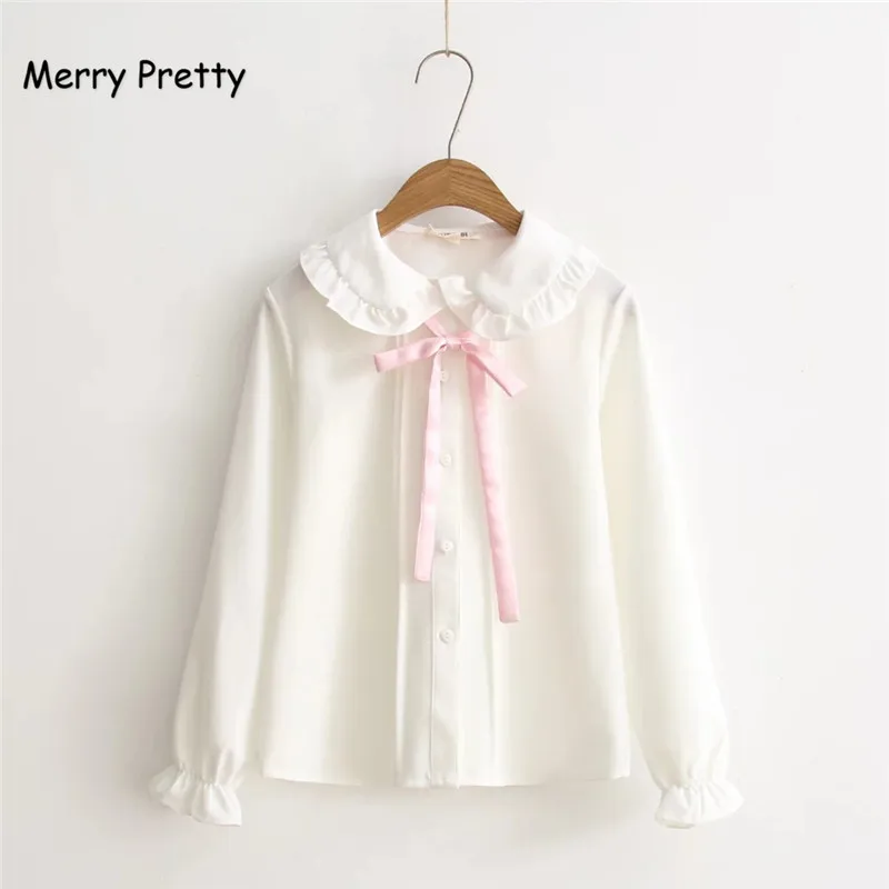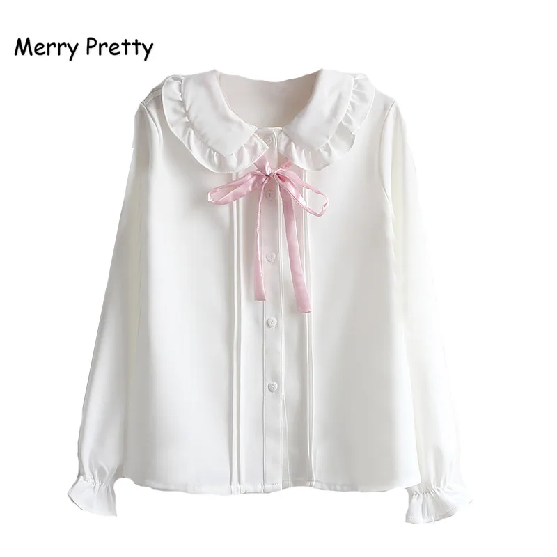 שמח די נשים חולצות בנות סתיו ארוך שרוול פיטר פן צווארון ורוד Bowknot לבן שיפון חולצה תלבושת בית ספר חולצה למעלה