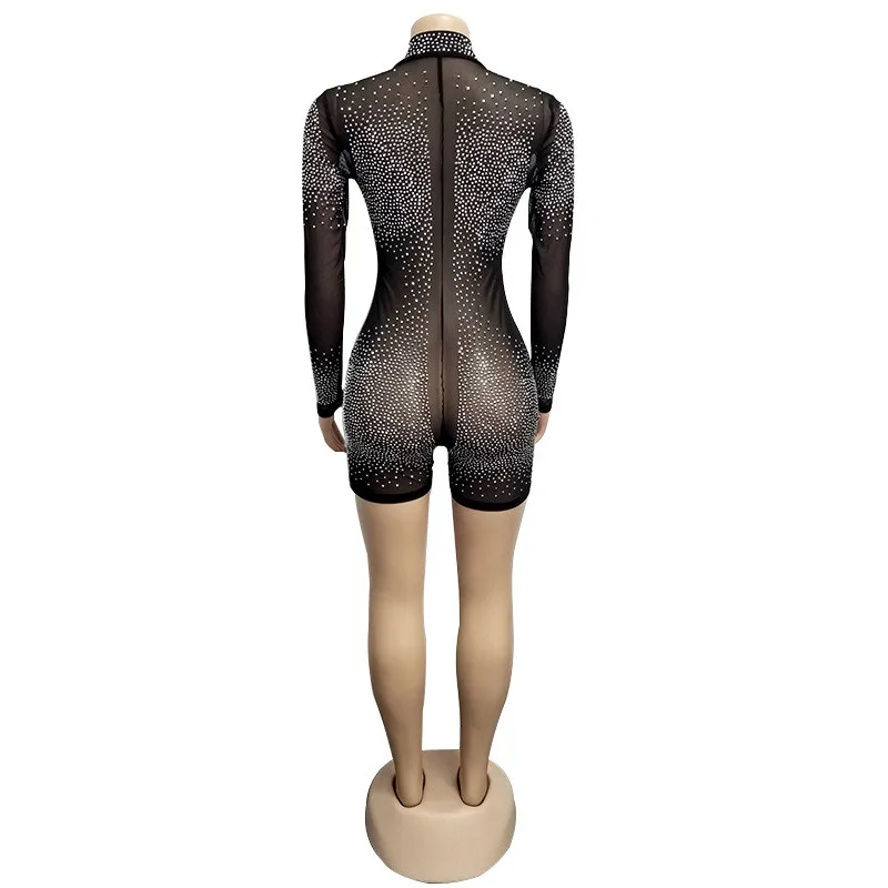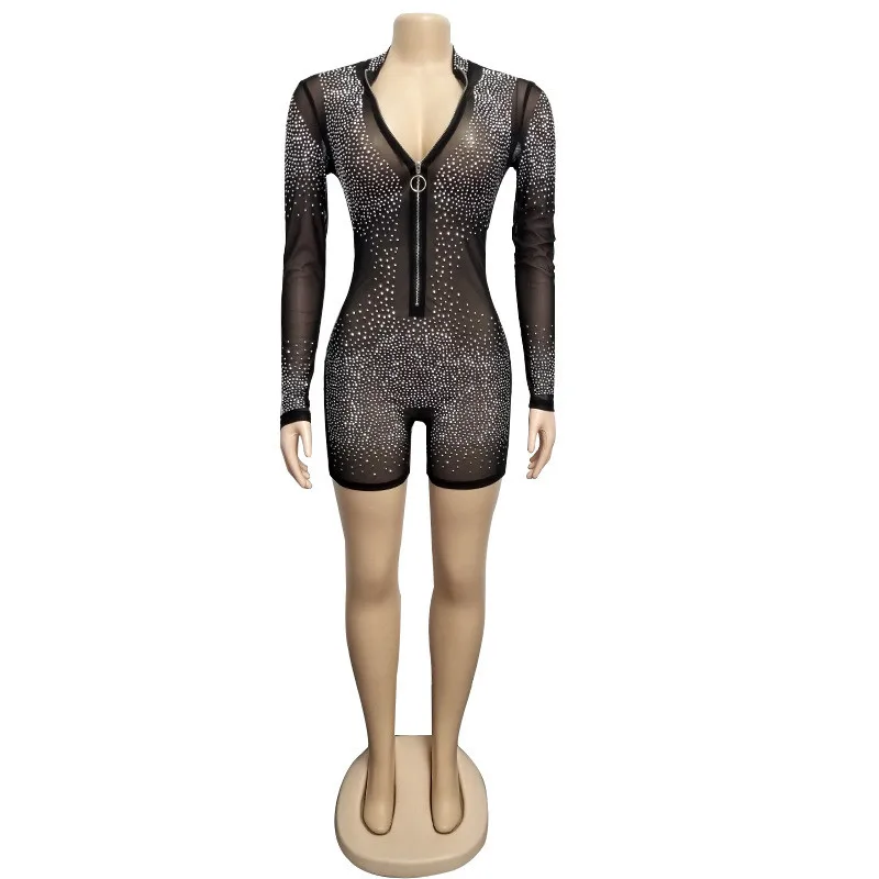 2019 נשים ארוך שרוול רשת נצנצים לראות דרך בגד גוף סרבל Clubwear עמוק V-צוואר קדמי רוכסן ספרקי Bodycon Slim Romper