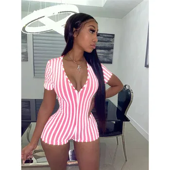 2020 נשים סקסיות עמוק V-צוואר Bodycon סרבל Romper הלבשת קצר שרוול פסים קיץ סרבל קצר Romper בגד גוף בגד גוף