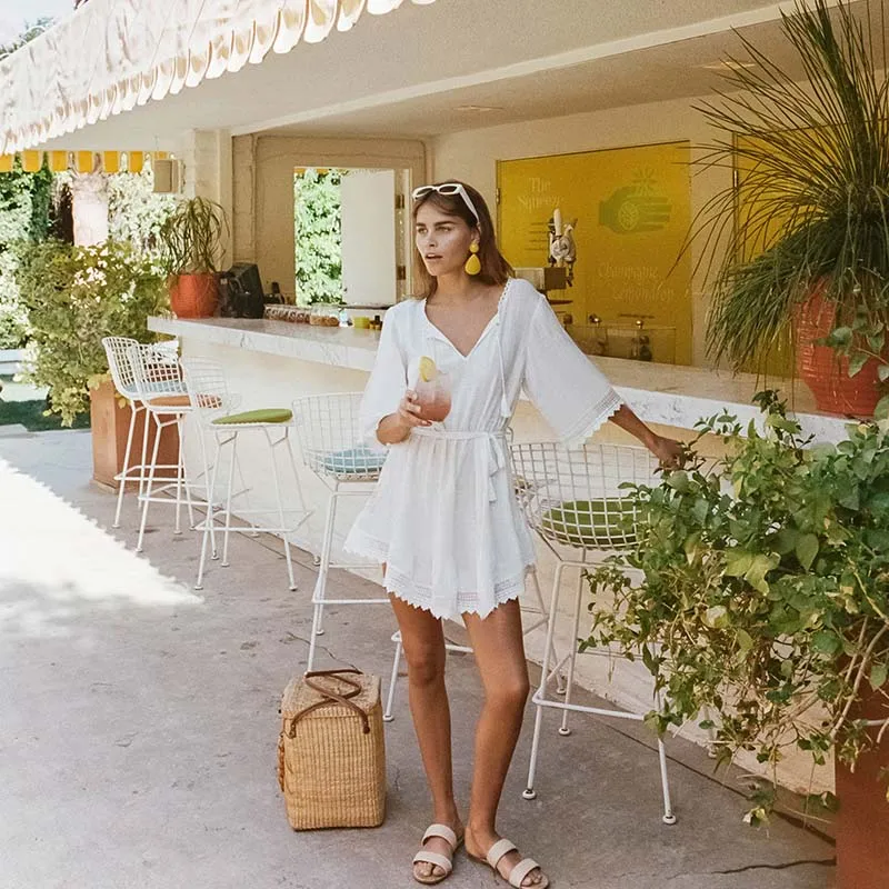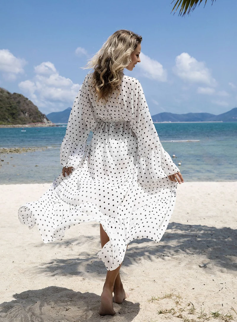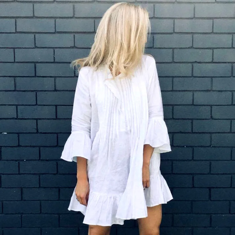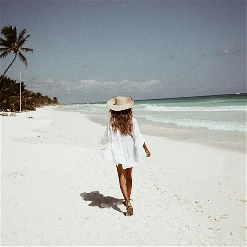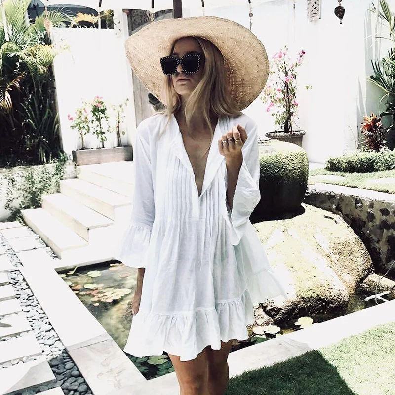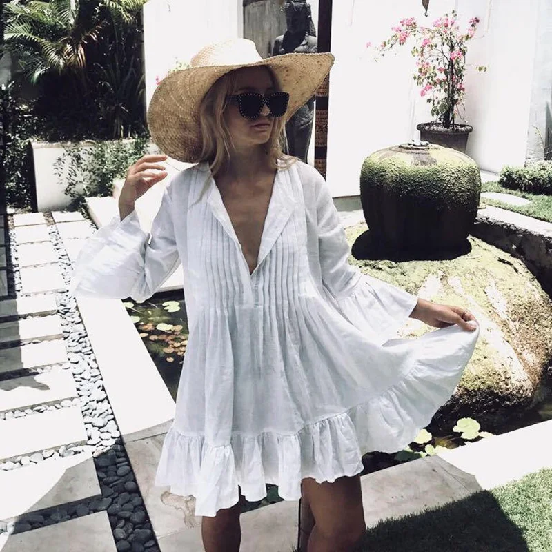2021 נשים בגד ים לחפות שרוול קפטן חוף טוניקת שמלת חלוק דה Plage מוצק לבן כותנה Pareo גבוהה צווארון וחוף