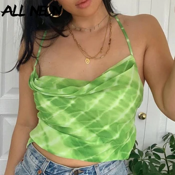 ALLNeon E-ילדה צבע עניבה ללא משענת תחבושת המפלגה חולצות אופנה קיץ חלול החוצה סקסי Camis חולצות שיק בציר מתוק ירוק יבול צמרות