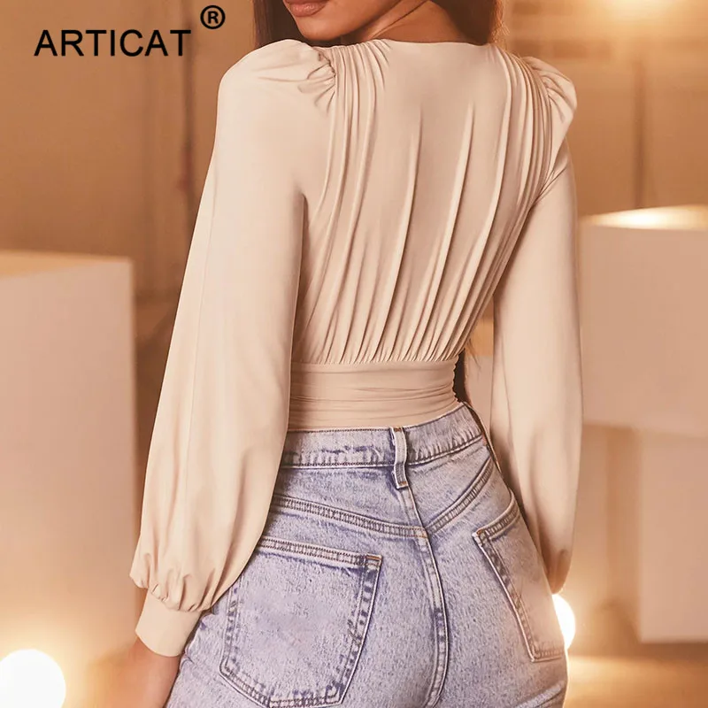 Articat שחור עמוק V צוואר בגד גוף נשים סקסי פאף שרוול Bodycon סרבל מוצק אלסטי מזדמן מסיבת חורף Bodysuits גוף חולצות