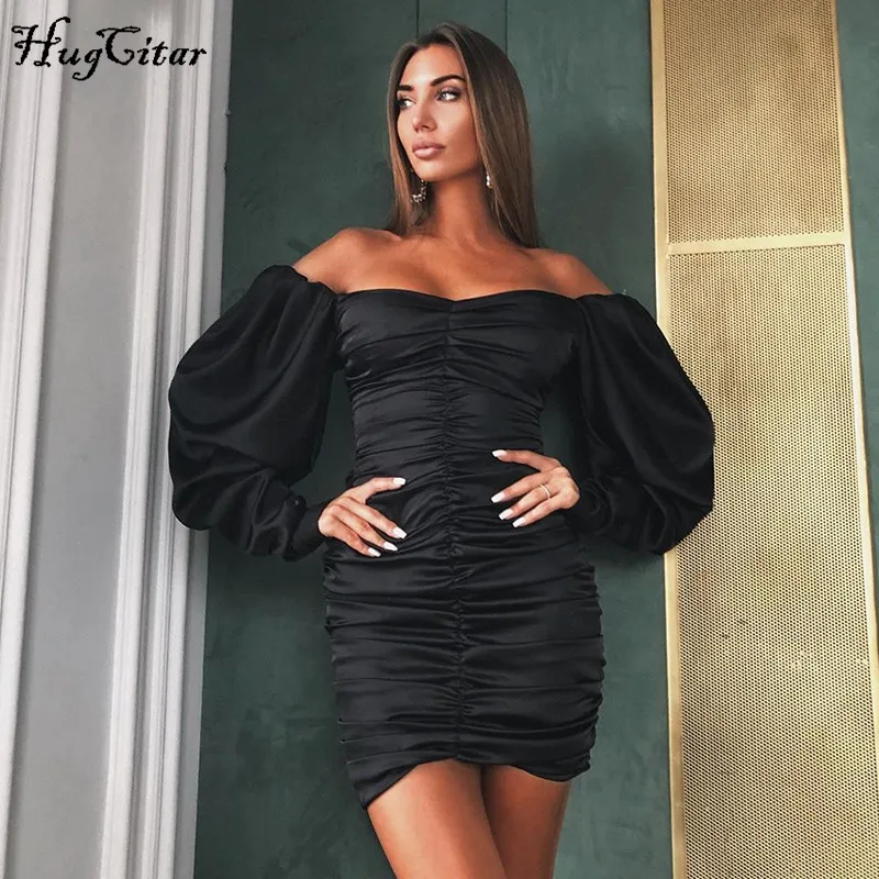Hugcitar 2019 ארוך פאף שרוול סלאש צוואר סאטן קפלים סקסי מיני שמלת סתיו חורף נשים מוצק מסיבת אלגנטי streetwear outfi