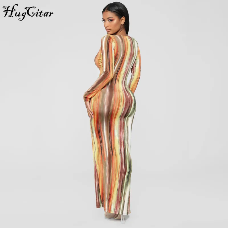 Hugcitar 2020 ארוך שרוול צבעוני הדפסת V-צוואר bodycon ארוך שמלת אביב נשים חדש אופנה streetwear מסיבת אלגנטי תלבושות