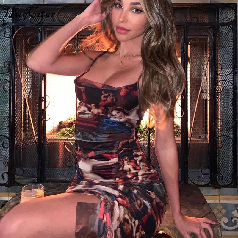 Hugcitar 2020 הדפסה ללא שרוולים קפלי ruched סקסי מיני שמלת אביב קיץ נשים אופנה streetwear תלבושות מועדון ללבוש