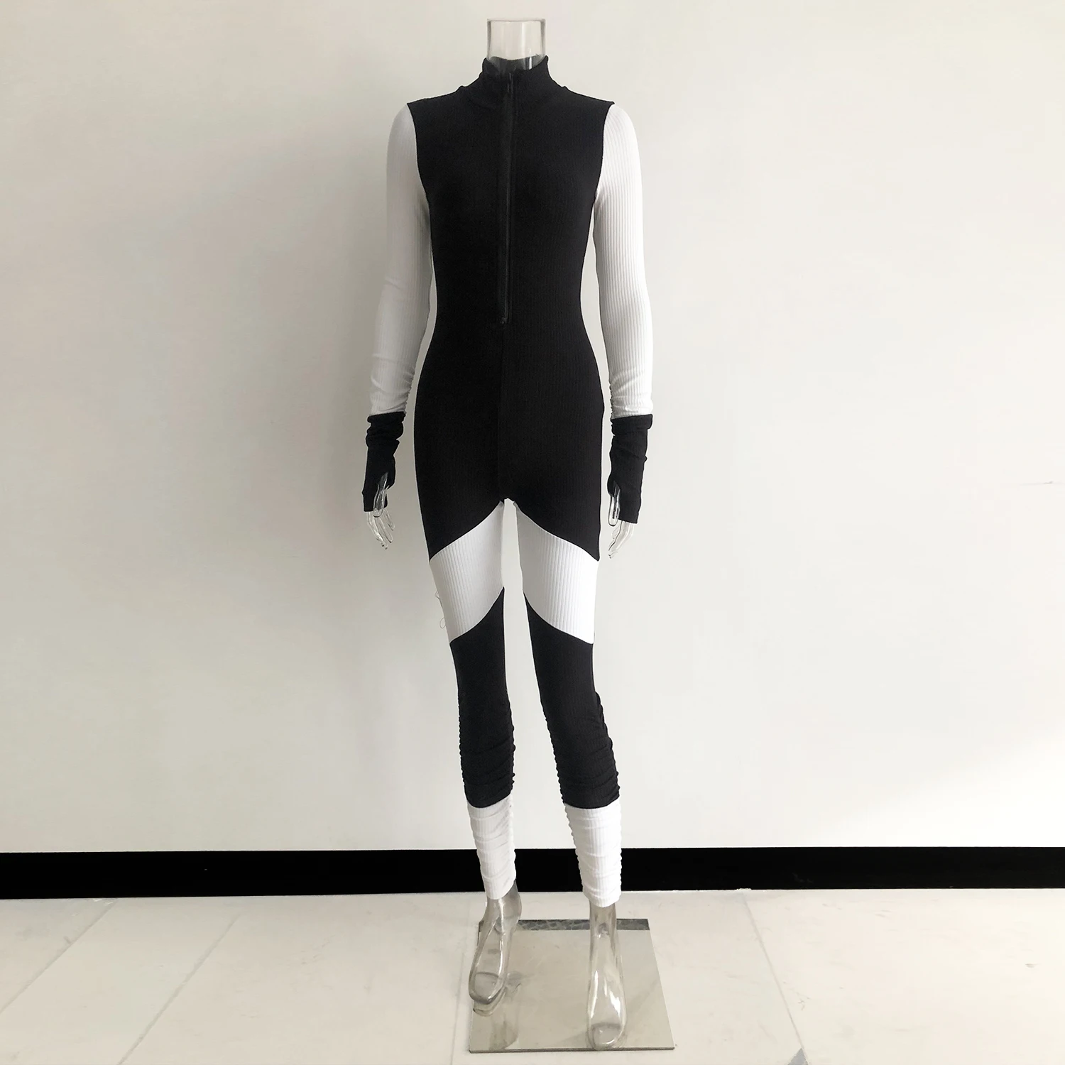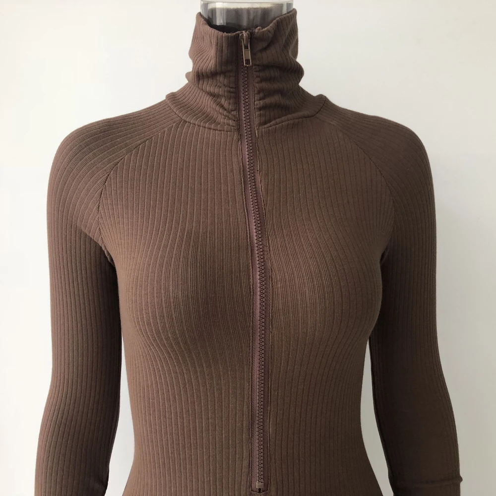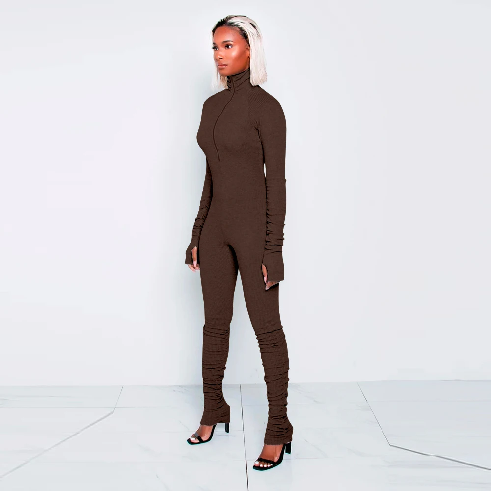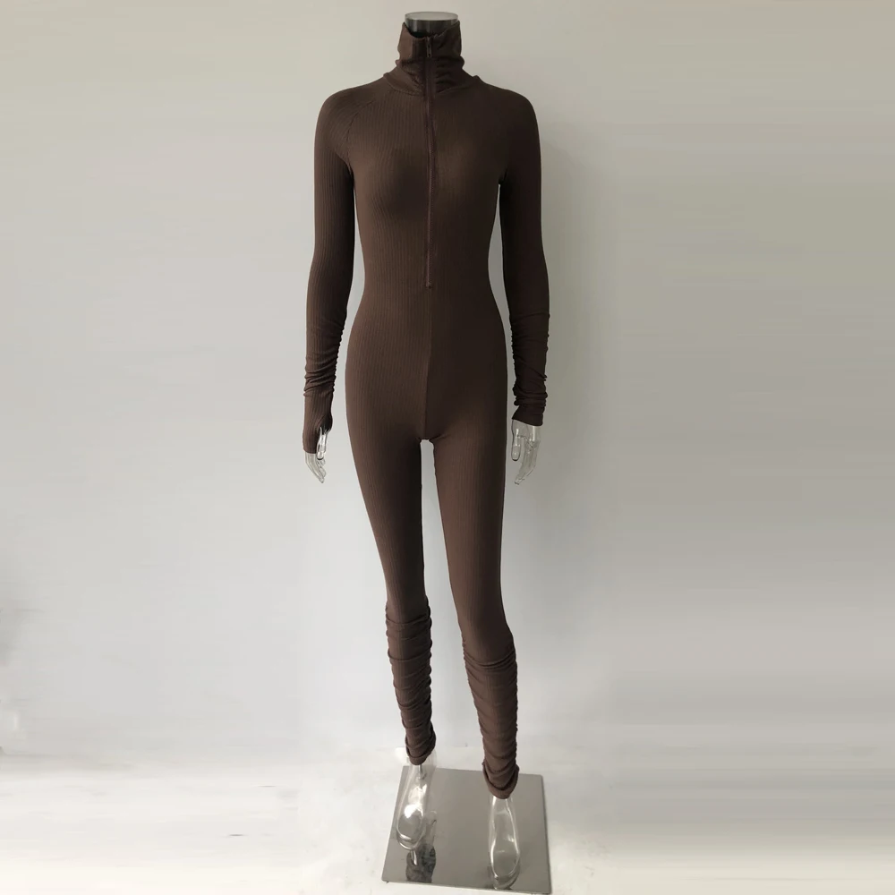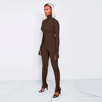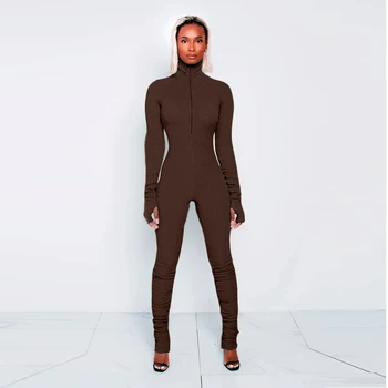 KGFIGU 2021 חדש הגעה נשים של חום Rompers גבוהה צוואר רוכסן Ruched סרבל מזדמן ארוך שרוול Clubwear חתיכה אחת בגדים
