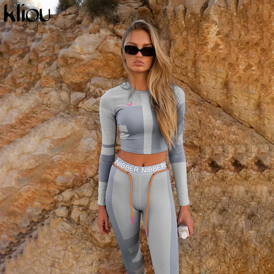 Kliou נשים כושר שתי חתיכות סט אימונית ארוך שרוול יבול למעלה מכתבי הדפסת אלסטי סקיני חותלות ספורט slim תלבושת