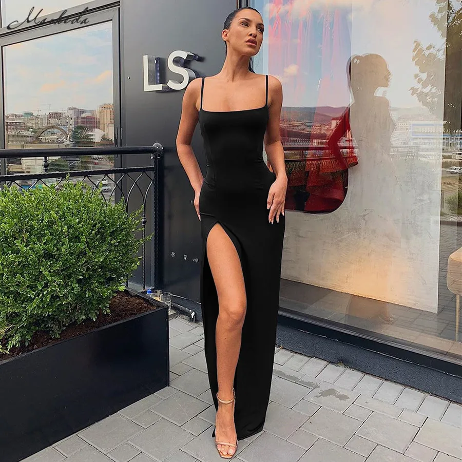 Macheda סתיו נשים ספגטי רצועת שמלת סתיו סקסי פיצול מוצק Slim ליידי קרסול אורך בציר ללבוש שמלת 2019 חדש