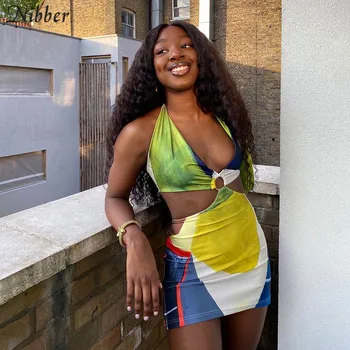 Nibber מועדון הניגוד פראי חלול החוצה אישה שמלות קיץ סקסי Bodycon טלאים Streetwear מזדמן מחשוף הלטר חוף שמלה