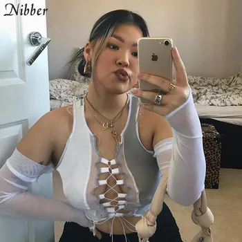 Nibber סקסי חורים לחתוך החוצה ציצית יבול למעלה קיץ אופנה טלאי רשת בד tees גותי פעילות מגניב slim ללא שרוולים חולצת טי