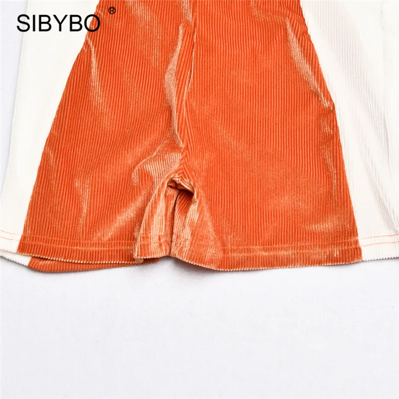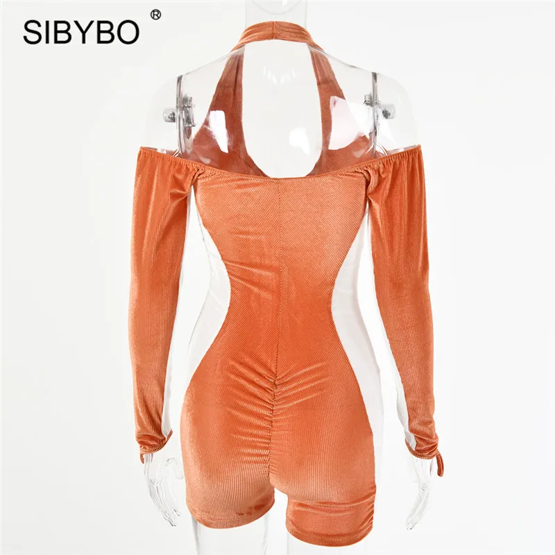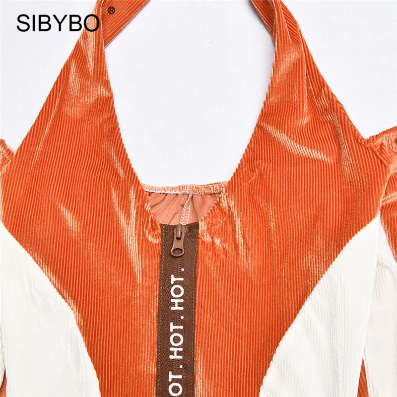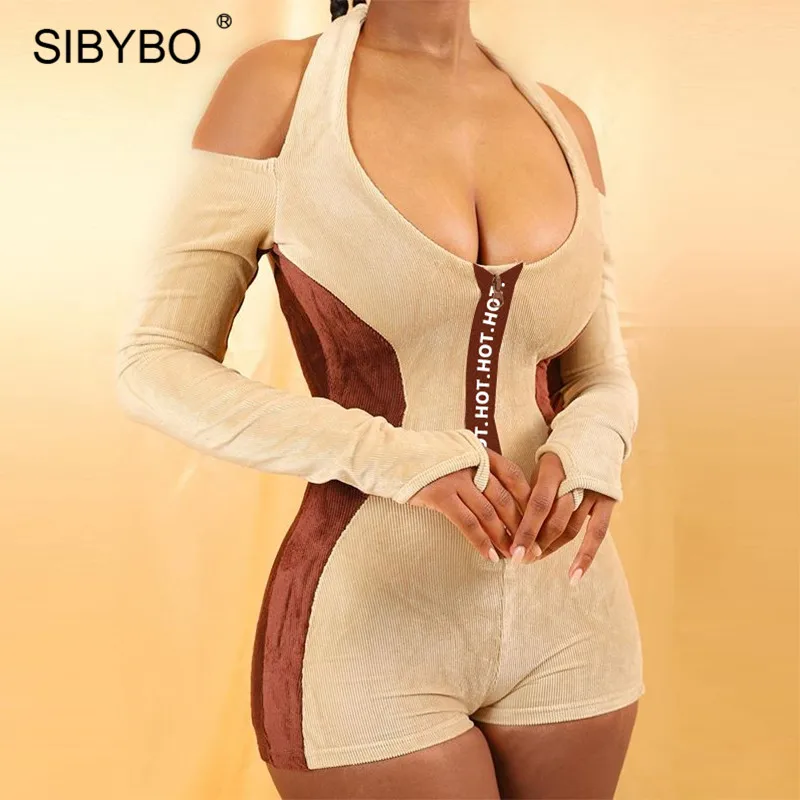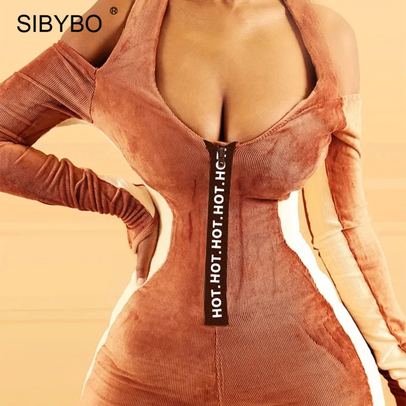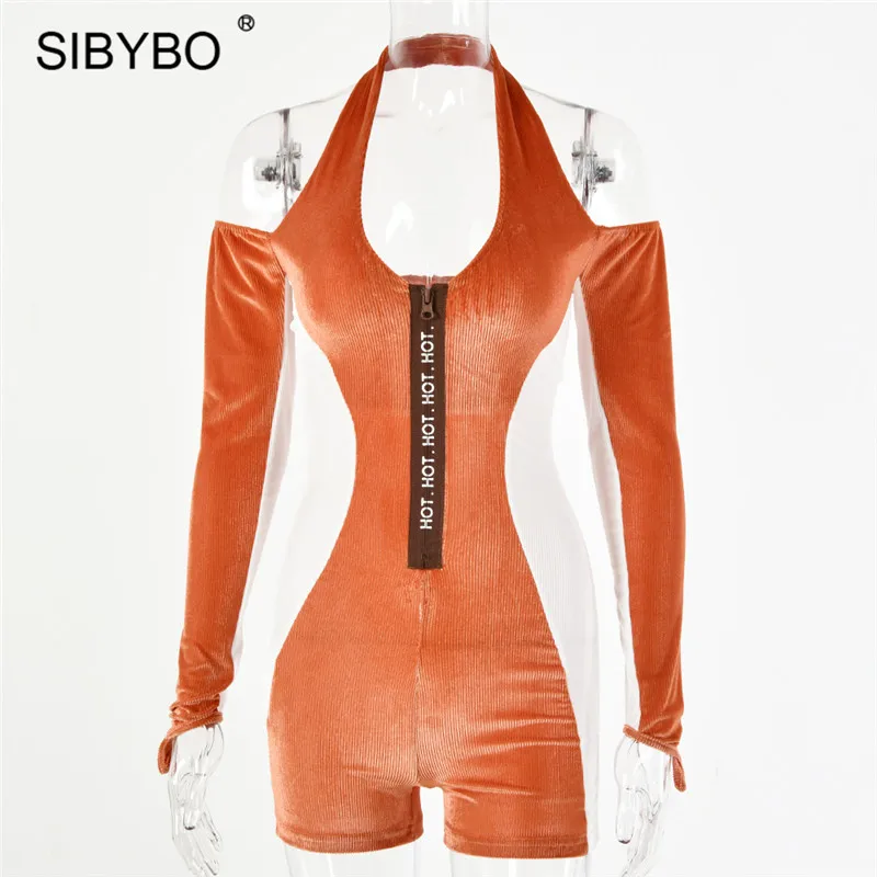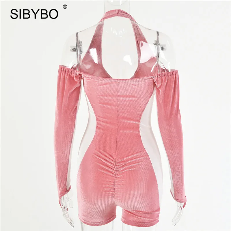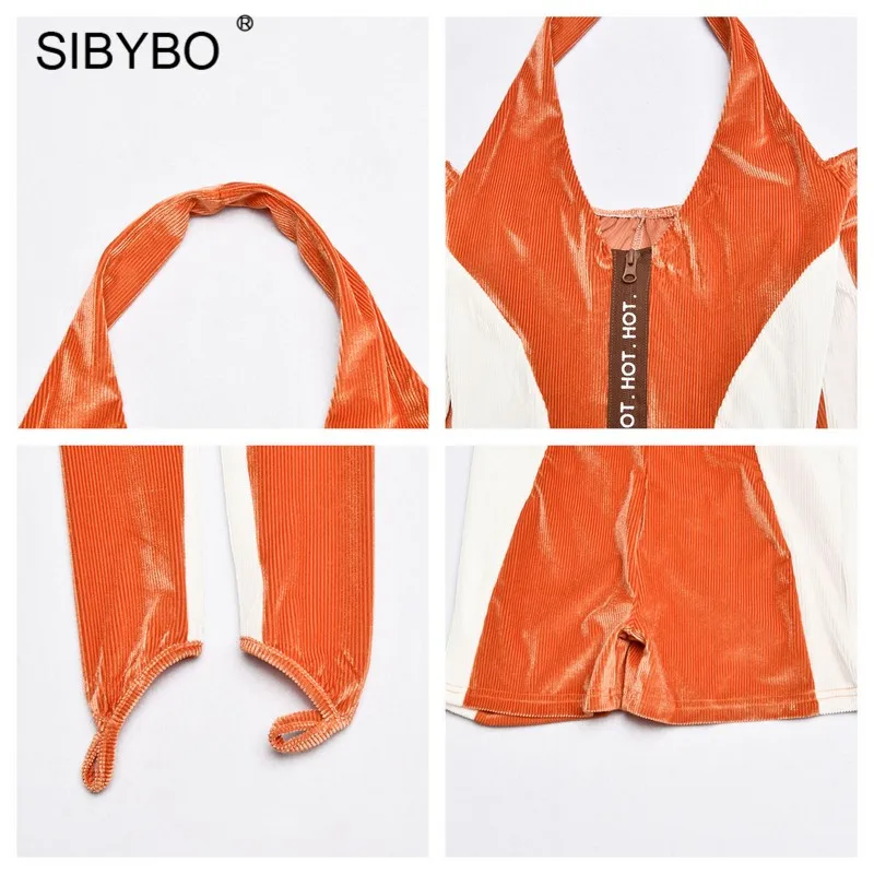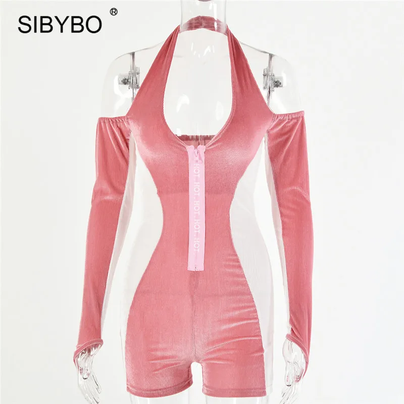 טיטל:SIBYBO קטיפה הלטר ללא משענת סקסית נשים Romper סרבלי סתיו טלאים Bodycon Playsuits חם רוכסן ספורטיבי כושר סרבל