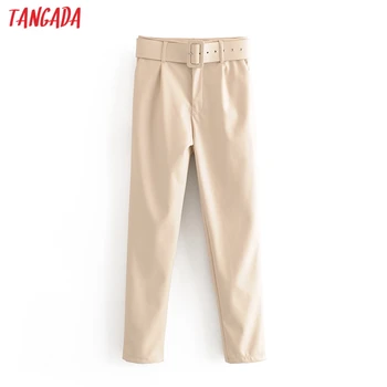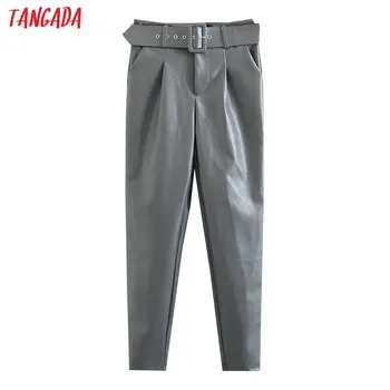Tangada נשים השחור פו עור חליפת מכנסיים גבוה מותן מכנסיים sashes כיסים משרד גבירותיי עור מפוצל מכנסיים 6A05