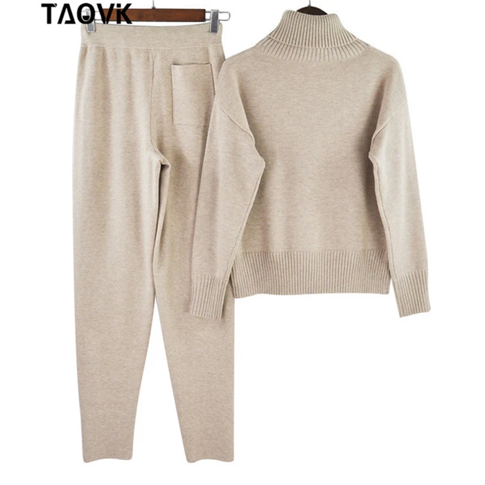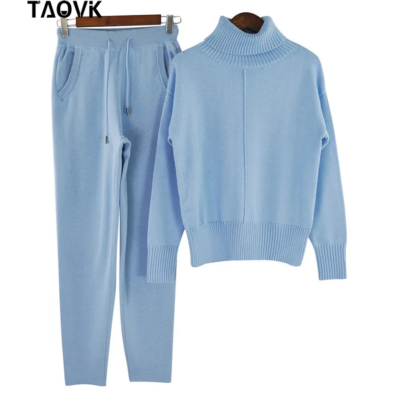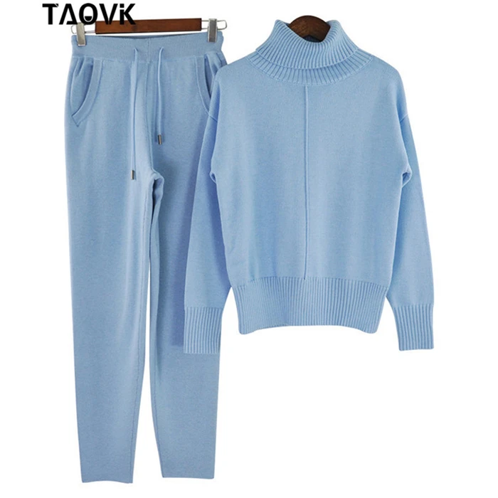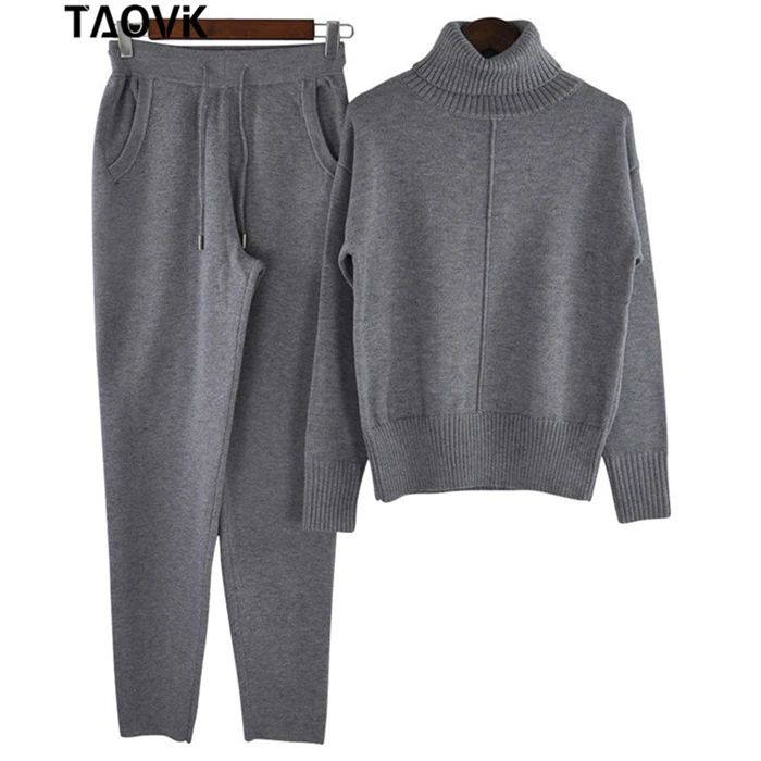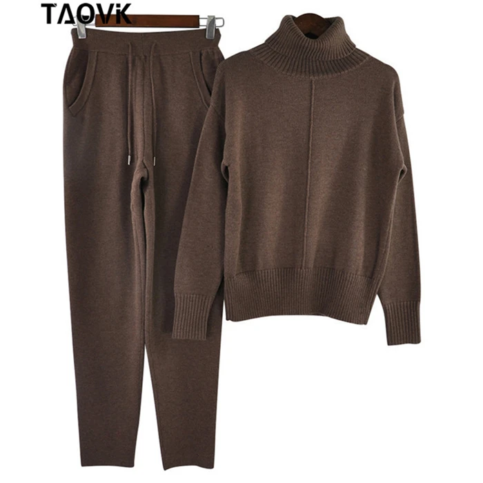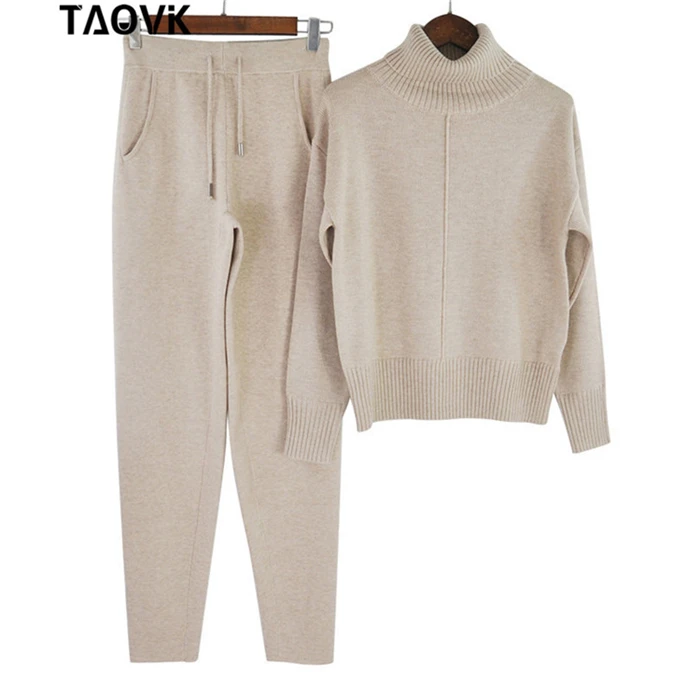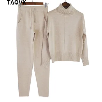 חורף צמר וקשמיר סרוג חם חליפת גבוה צווארון סוודר + מינק קשמיר מכנסיים רופף סגנון שני חלקים סט לסרוג