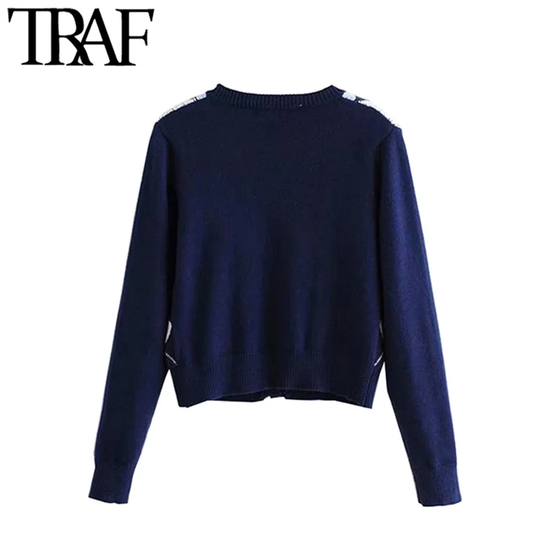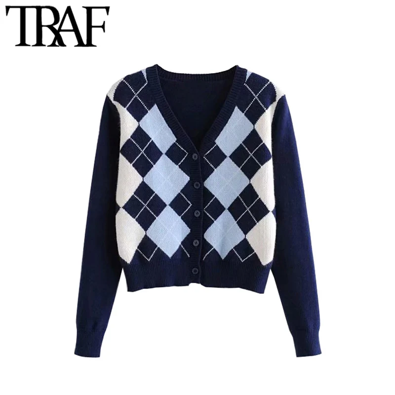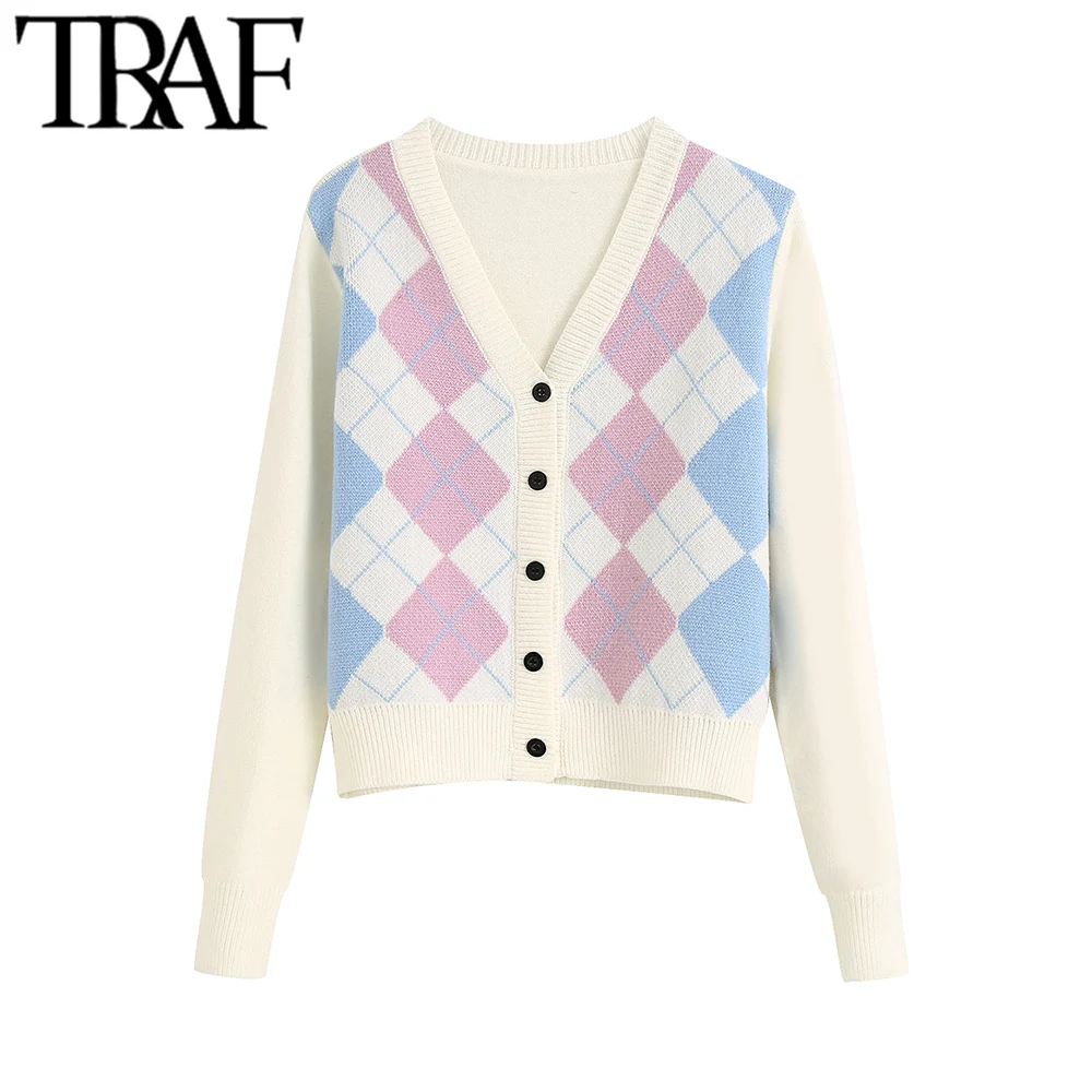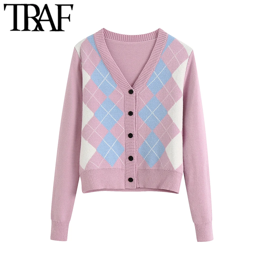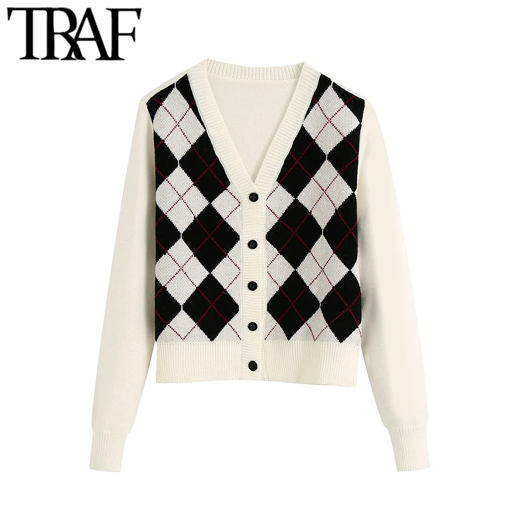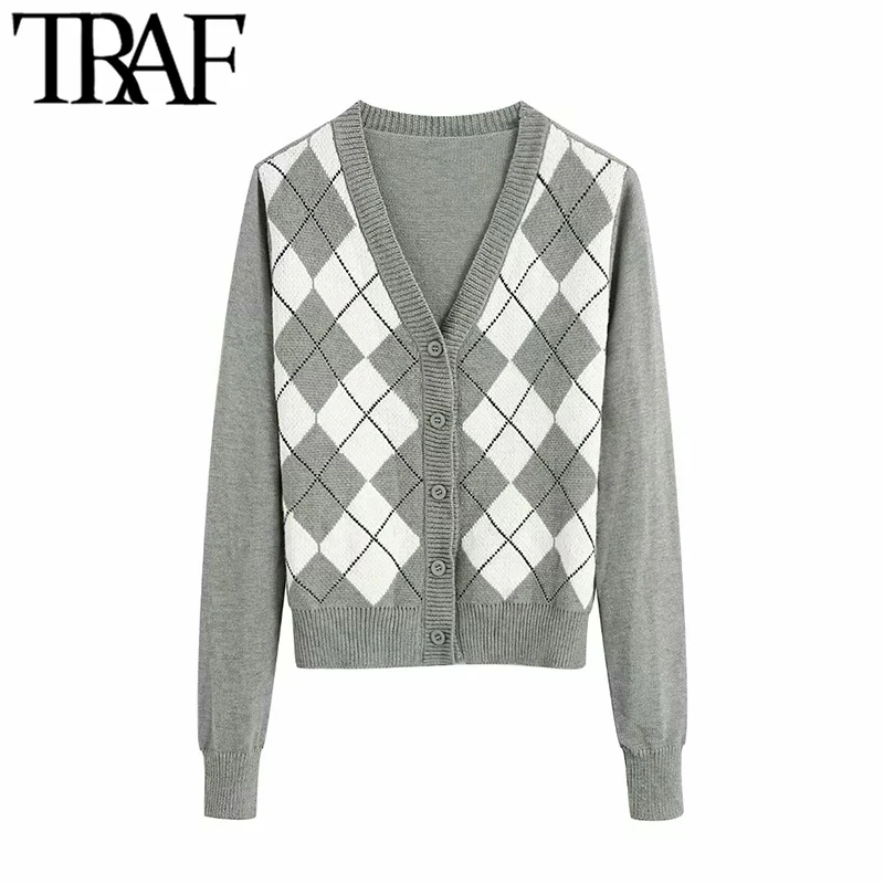 TRAF נשים קרדיגן בציר אופנתי גיאומטרי דפוס קצר סרוג סוודר אופנה ארוך שרוול אנגליה סגנון הלבשה עליונה Chaqueta