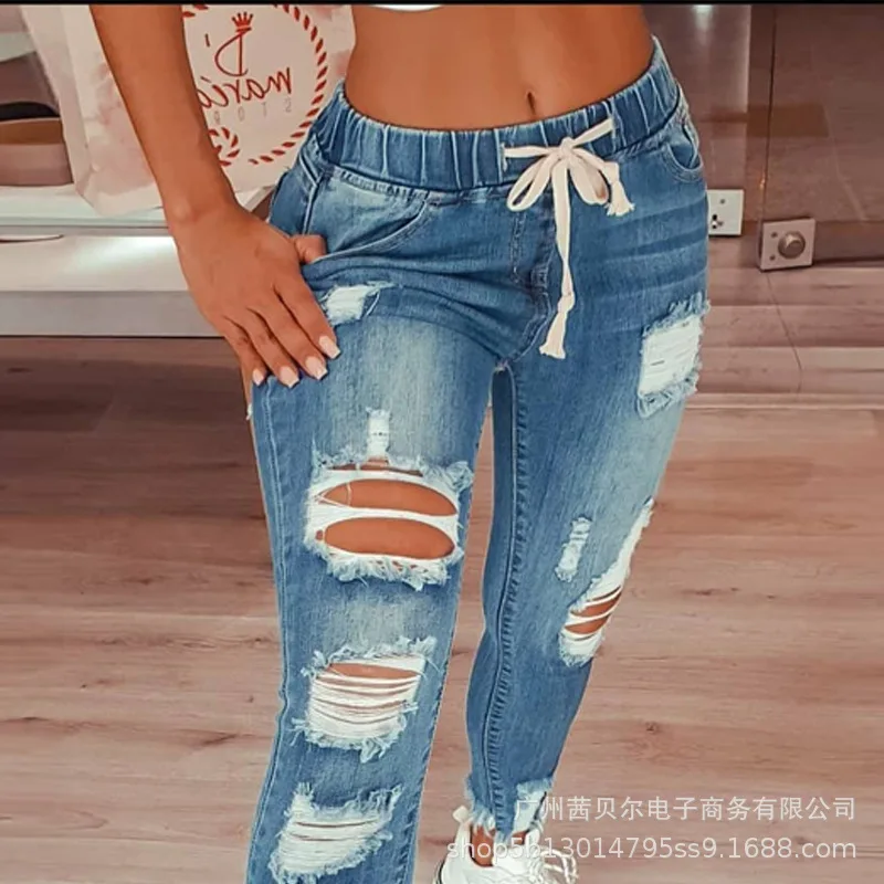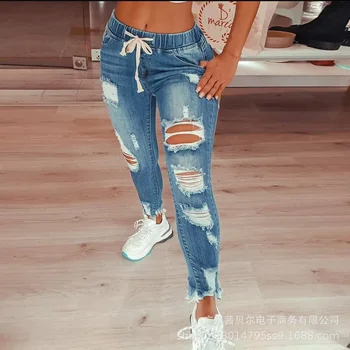 WEPBEL נשים של אופנה היפ הופ שבורה חורי ג 'ינס ג' ינס שרוך Ripped מכנסי עיפרון